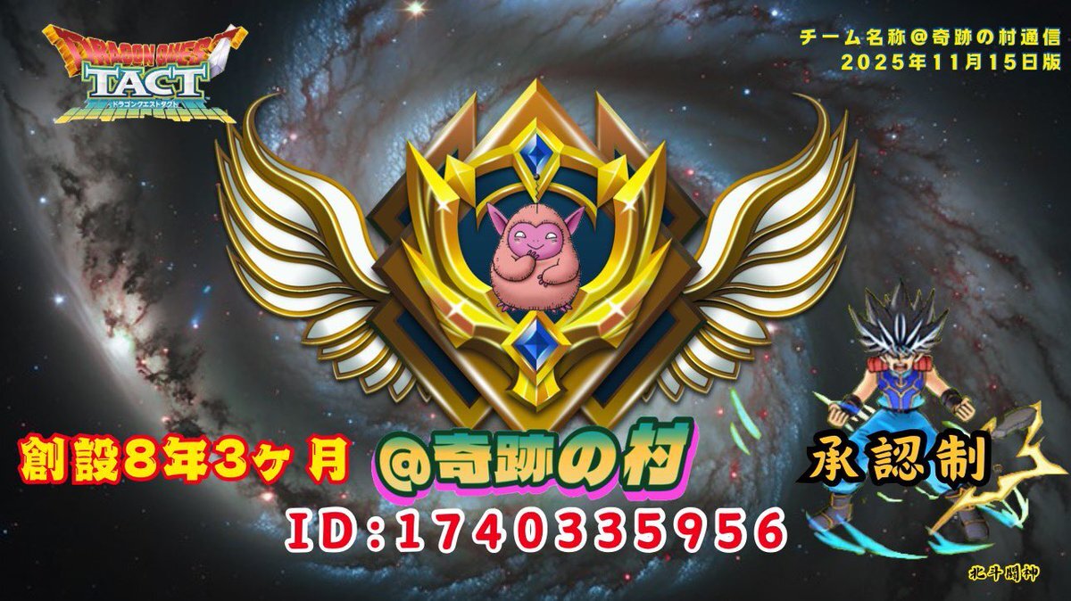 皆さん 今晩お疲れ様です 2025年11月15日で、 チーム名称@奇跡の村は 創設8年3ヶ月目 現在はタクトチームとして 2代目無法者さんが チームを運営してます 今後ともご指導ご鞭撻と ご支援のほど 宜しくお願いします🙇 #ドラゴンクエスト #DQMSL #ドラクエタクト チーム@奇跡の村 pic.x.com/GZjeBSMZKD