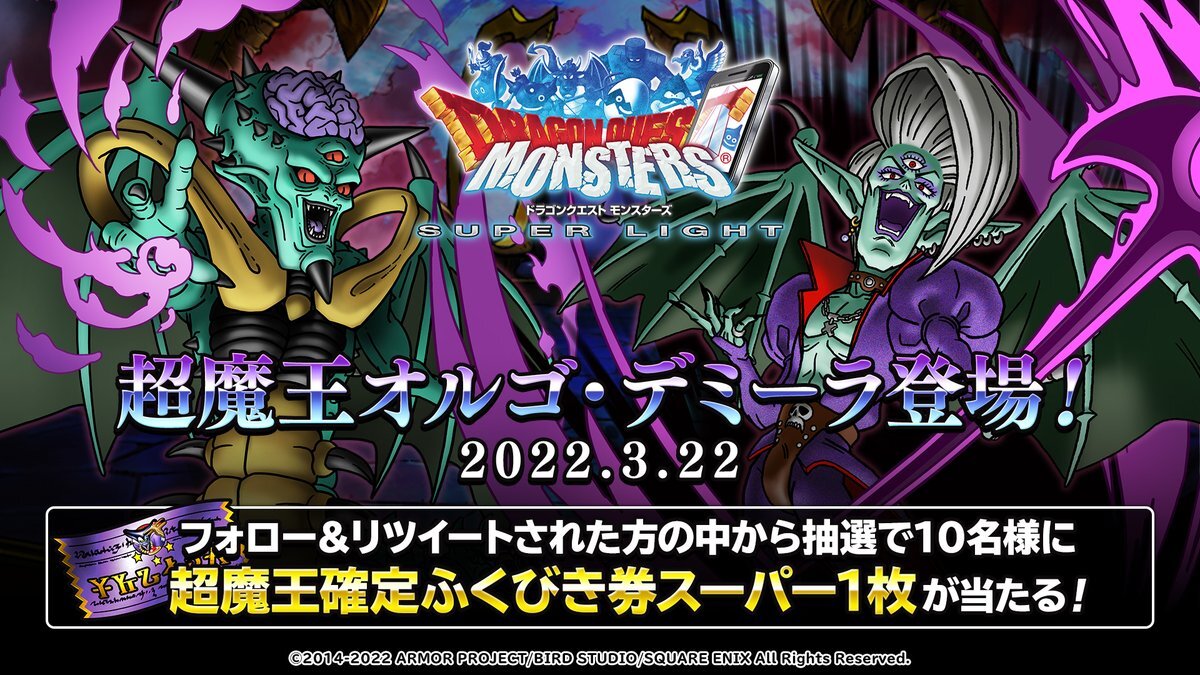 2022年3月22日、超魔王オルゴ・デミーラが降臨!! 「超魔王確定ふくびき券スーパー1枚」が10名様に当たる豪華キャンペーンを開催! @DQMSL_OFFICIALをフォロー&本ツイートをRTした方から抽選でプレゼント! 詳細は ⇒ cache.sqex-bridge.jp/guest/informat… #超魔王オルゴ・デミーラ #DQMSL pic.x.com/PN3jtQsj3Z