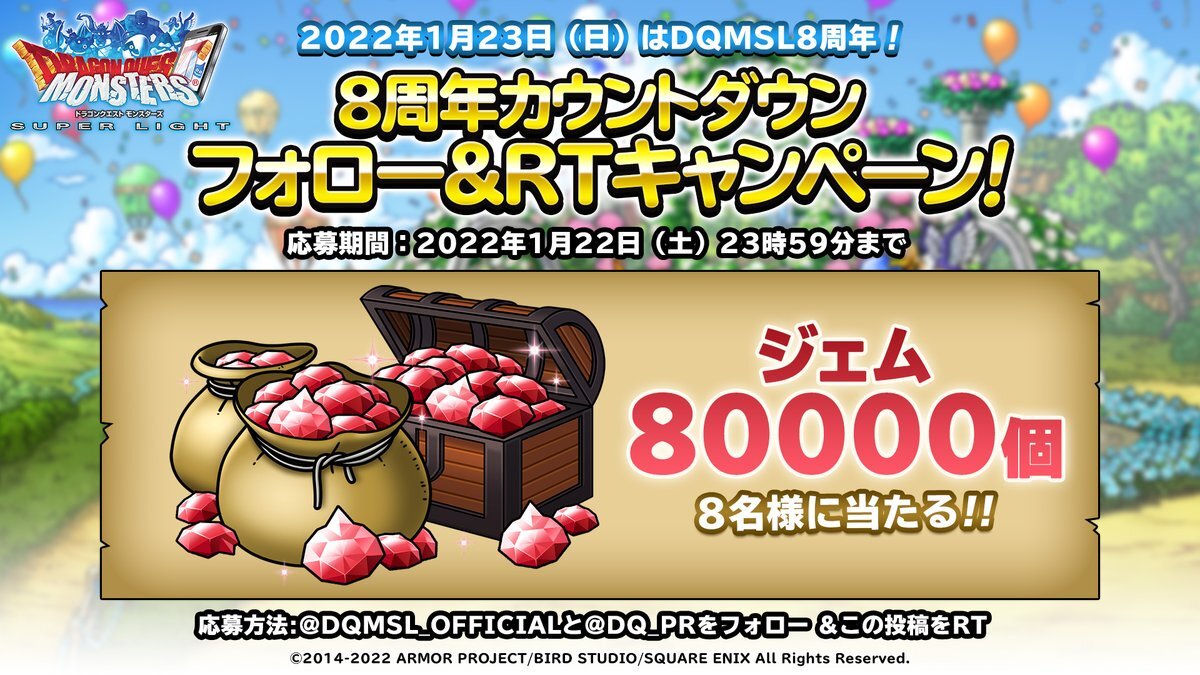 1月23日(日)はDQMSLアニバーサリー! 8周年直前を記念して@DQ_PRとダブルで8周年カウントダウンフォロー&RTキャンペーンを開催! ▼応募方法 ①@DQMSL_OFFICIALと@DQ_PRをフォロー ②この投稿をRT ▼@DQ_PR のキャンペーンは ↑こちらからチェック #DQMSL #ドラクエ #DQ pic.x.com/EyW0foI1qX