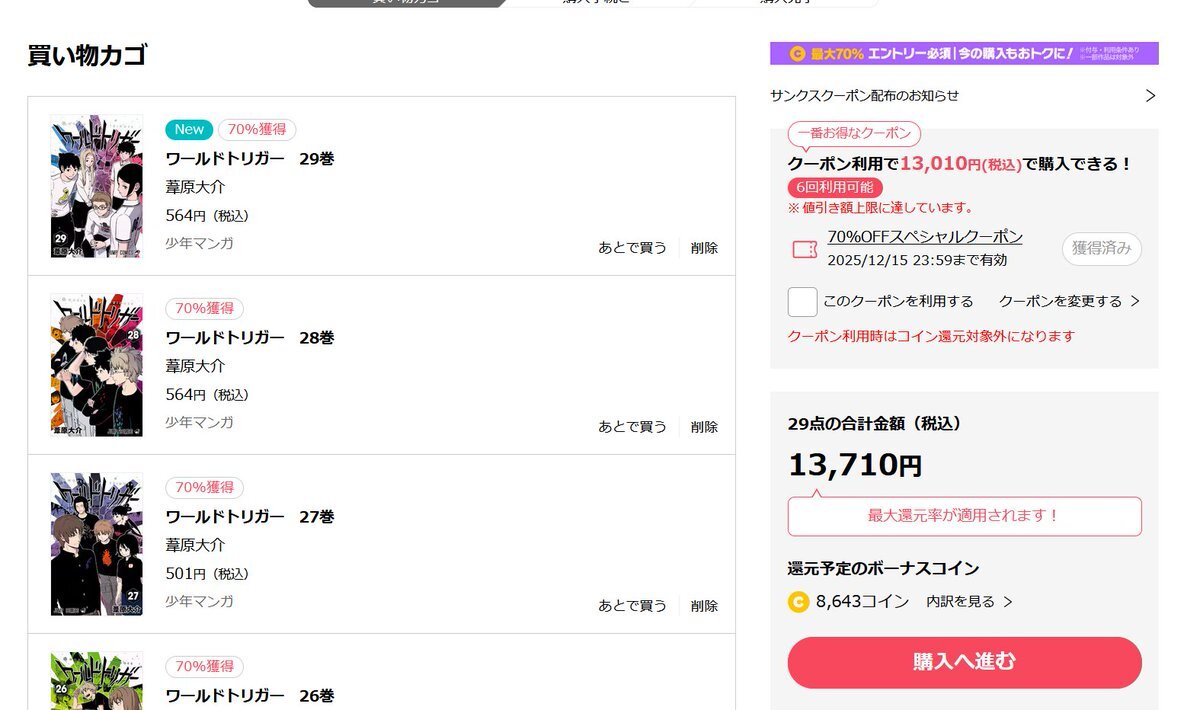 ワールドトリガー29巻が実質 5,000円かー、、、 めっちゃ安いな #ebook pic.x.com/rqm8bdCIcW