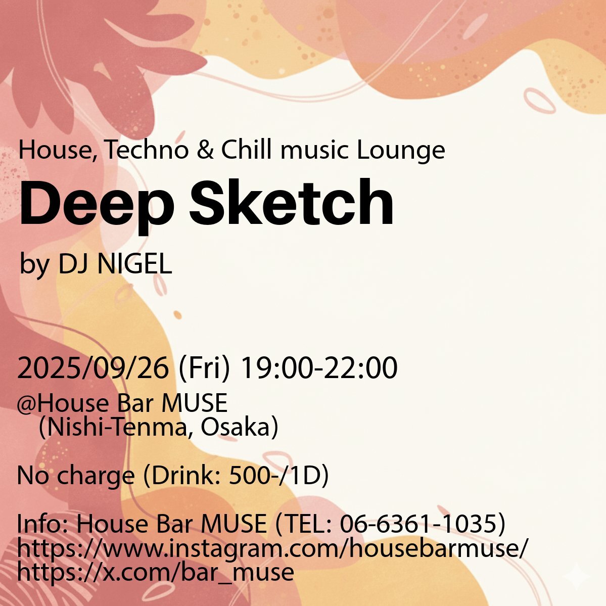 【あす!】 9/26(金)19:00-22:00 "Deep Sketch" by DJ NIGEL @ House Bar Muse @bar_muse (大阪・西天満) ノーチャージ(ドリンク:500円~) ぼくのDJ、ラストでございます。 来てや~。 ja.ra.co/events/2247967 #electronica #chillout #nujazz #housemusic #deephouse #soulfulhouse pic.x.com/9vpzRhmzGJ