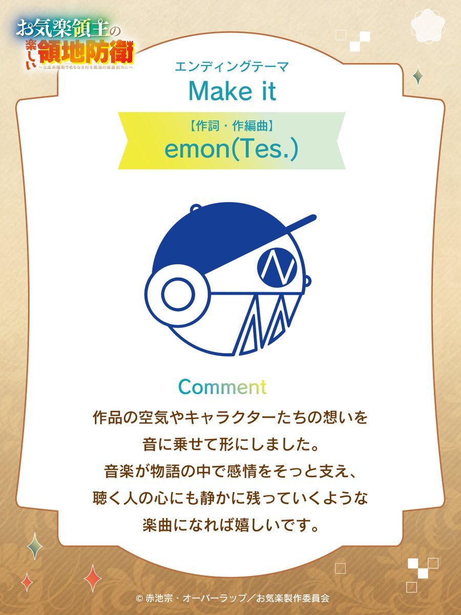 ⚙️‧⁺ ⊹˚.┈┈┈┈  エンディングテーマ解禁     ┈┈┈┈‧⁺ ⊹˚.✴️⚙️   うた:#大渕野々花 楽曲:「Make it」 作詞・作編曲:#emon(Tes.)   大渕さんからコメントも到着! 「どうかこの曲を聴いて『お気楽』に😊」   是非、第三弾PVで聞いてみてください😊🎶 #お気楽領主アニメ pic.x.com/oEvOosrMpu