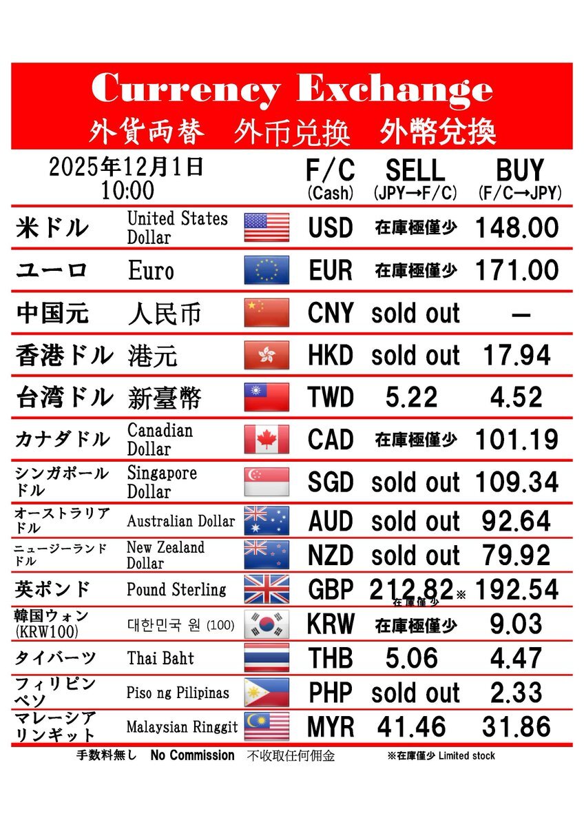 こんにちは。 #外貨両替フラッグスタッフ です。 為替レートの変化につき12時よりレート変更します。 宜しくお願い致します。 12月1日 12時発信 #横浜 #中華街 #海外旅行 #外貨両替 #exchange #yokohama pic.x.com/6U9qgZoAct