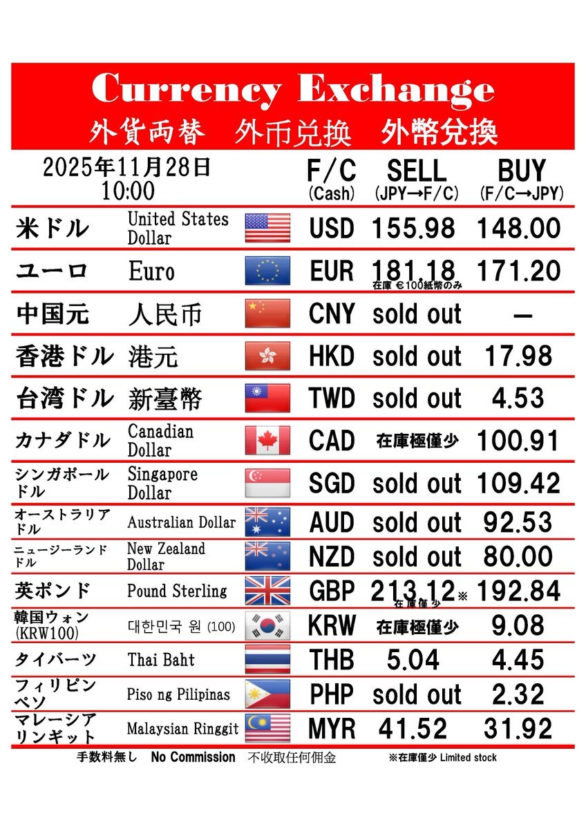 おはようございます #外貨両替フラッグスタッフ です 2025年11月28日(金)の両替レートです Skypeサービス終了に伴い「050-5539-9999」の提供が終了しました 今後は eメール info@flagstaff.co.jpにてお問い合わせ願います 宜しくお願い致します #横浜 #中華街 #海外旅行 #外貨両替 #exchange #yokohama pic.x.com/AmsSC81dsM