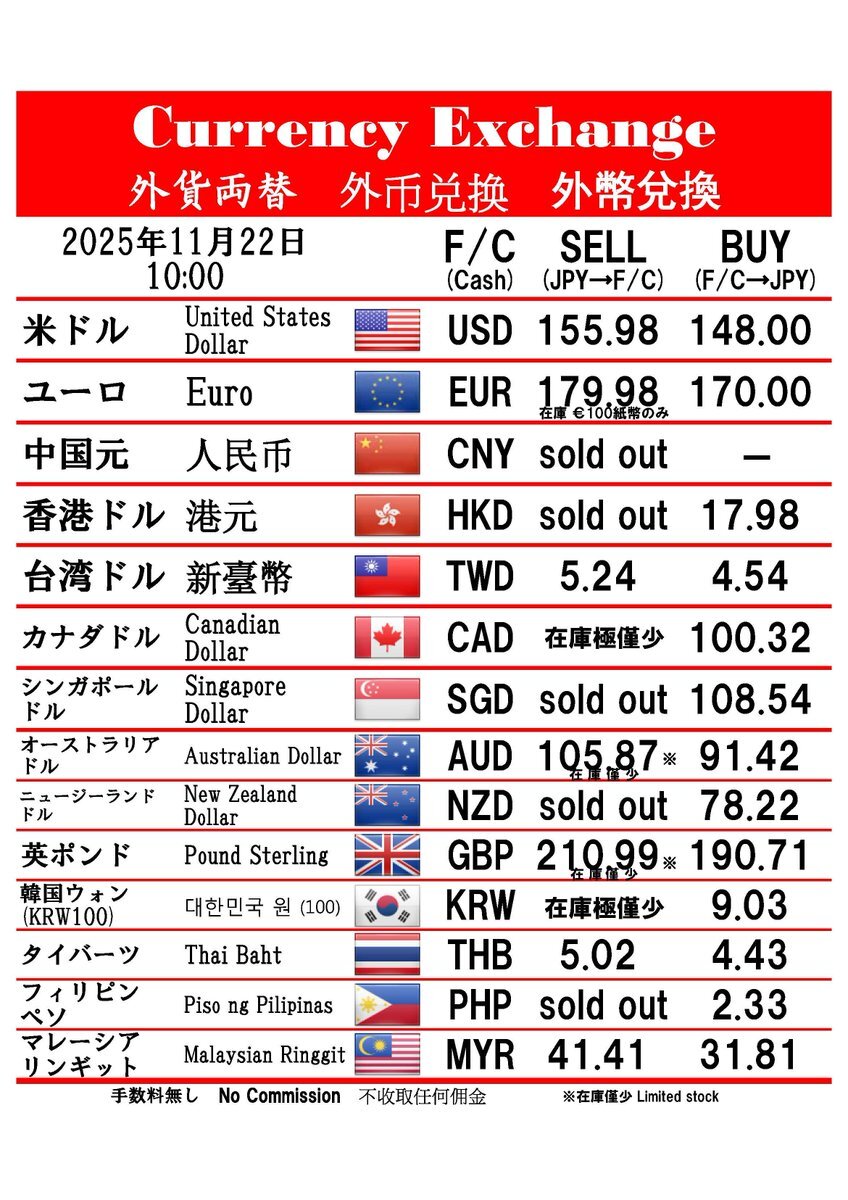 おはようございます #外貨両替フラッグスタッフ です 2025年11月23日(日) の両替レートです Skypeサービス終了に伴い050-5539-9999の提供が終了しました 今後は eメール info@flagstaff.co.jp へお問い合わせ願います 宜しくお願い致します #横浜 #中華街 #海外旅行 #外貨両替 #exchange #yokohama pic.x.com/S55MfYO9LV