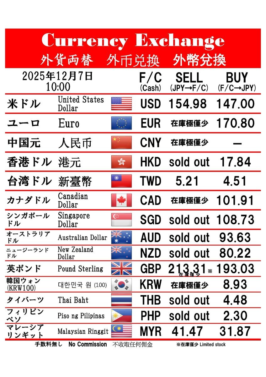 おはようございます #外貨両替フラッグスタッフ です 2025年12月4日(木)の両替レートです Skypeサービス終了に伴い「050-5539-9999」の提供が終了しました 今後は eメール info@flagstaff.co.jpにてお問い合わせ願います 宜しくお願い致します #横浜 #中華街 #海外旅行 #外貨両替 #exchange #yokohama pic.x.com/uVtFYiTQxx
