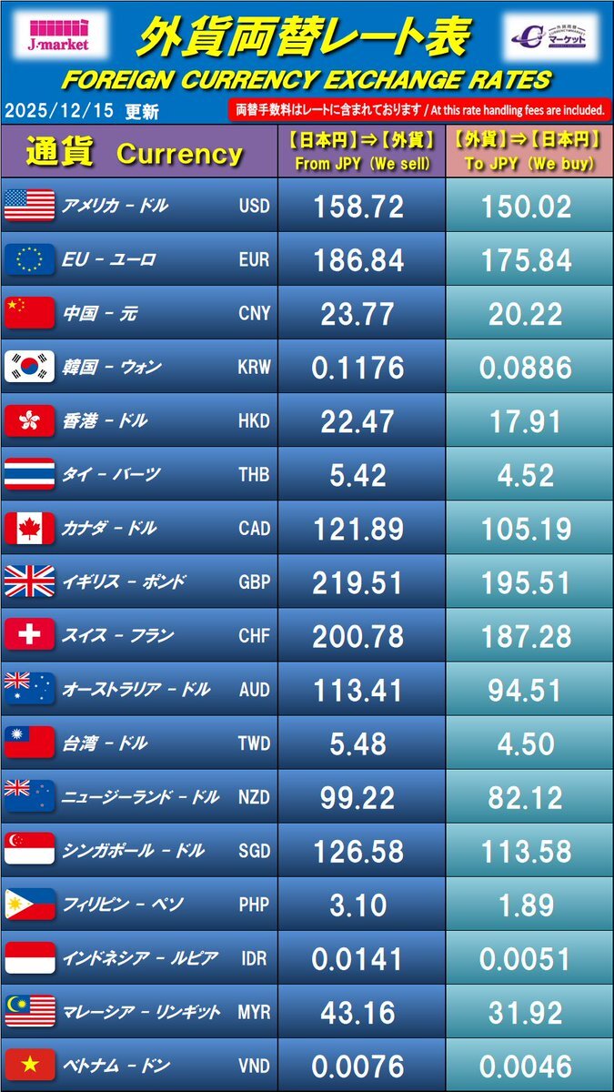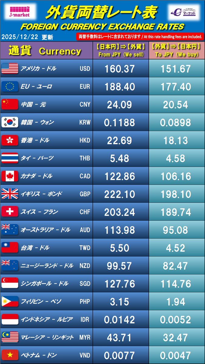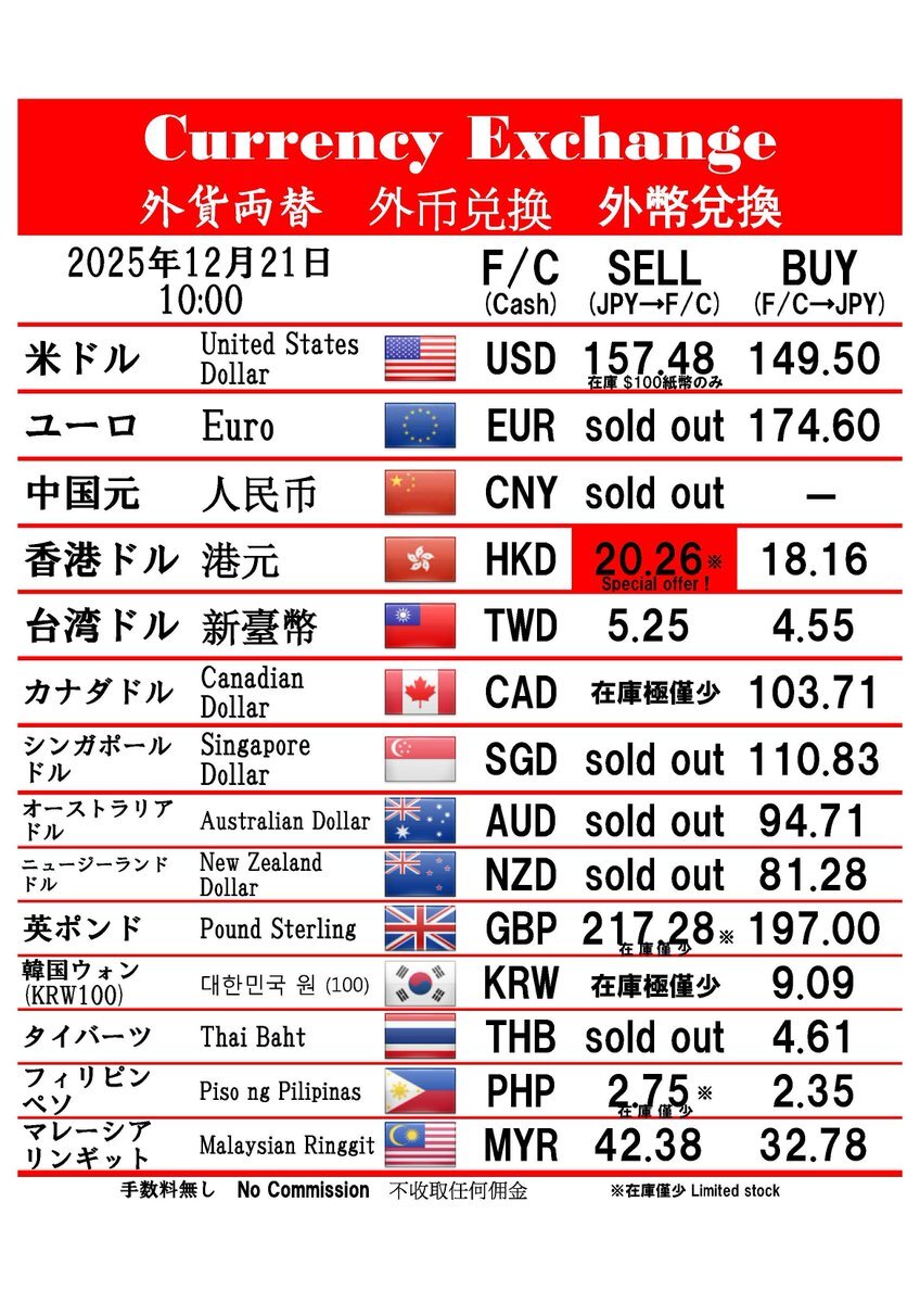 おはようございます #外貨両替フラッグスタッフ です 2025年12月20日(土) の両替レートです Skypeサービス終了に伴い050-5539-9999の提供が終了しました 今後は eメール info@flagstaff.co.jp へお問い合わせ願います 宜しくお願い致します #横浜 #中華街 #海外旅行 #外貨両替 #exchange #yokohama pic.x.com/RKYvDRzouw