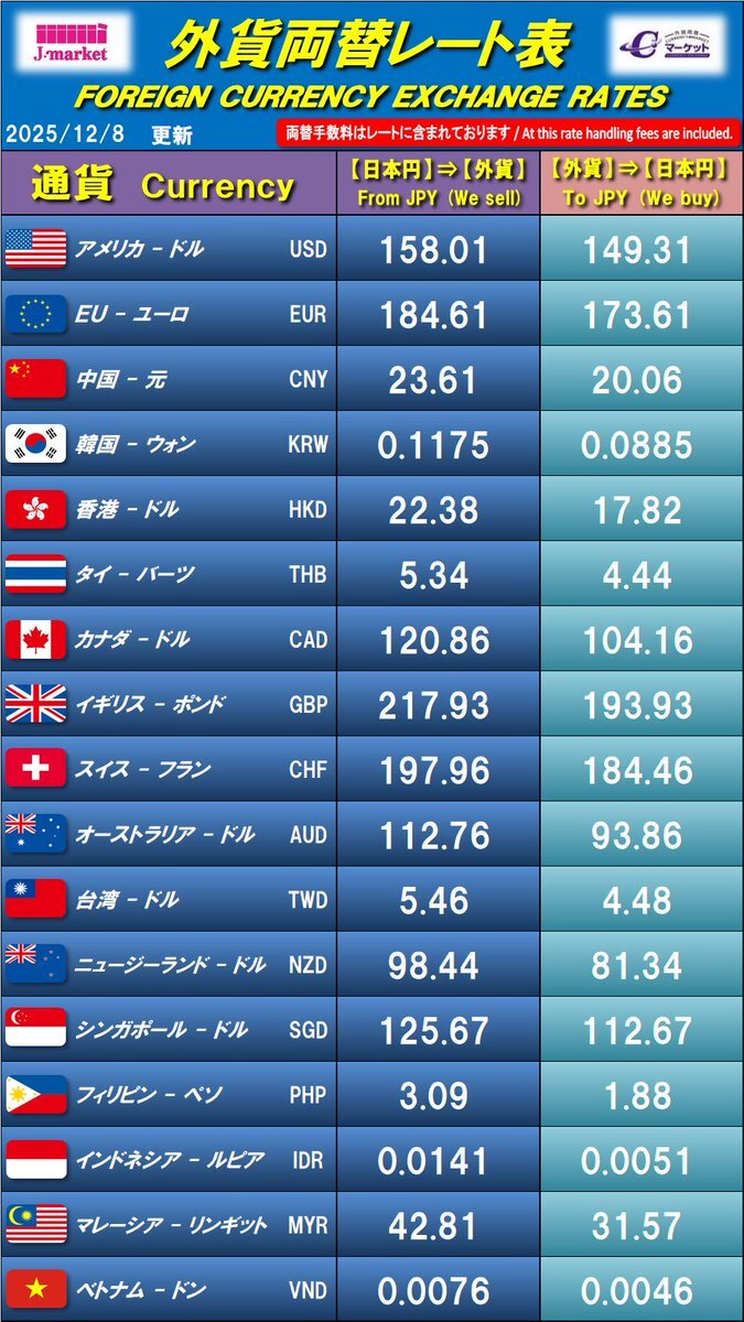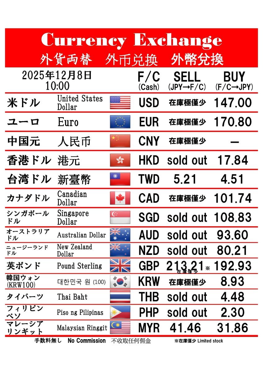 おはようございます #外貨両替フラッグスタッフ です 2025年12月8日(月)の両替レートです Skypeサービス終了に伴い「050-5539-9999」の提供が終了しました 今後は eメール info@flagstaff.co.jpにてお問い合わせ願います 宜しくお願い致します #横浜 #中華街 #海外旅行 #外貨両替 #exchange #yokohama pic.x.com/c8sEbVxXMd
