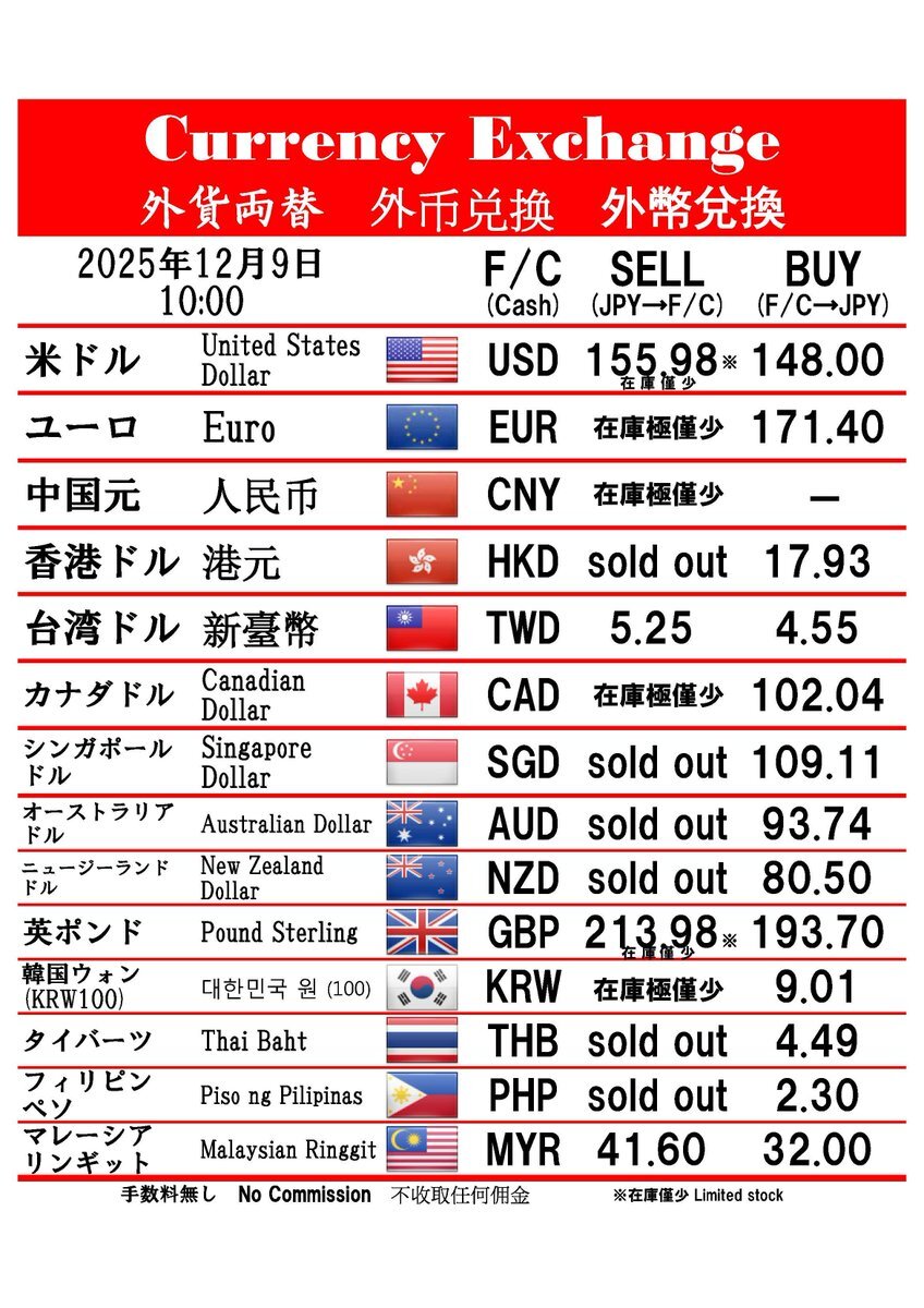 おはようございます #外貨両替フラッグスタッフ です 2025年12月9日(火)の両替レートです 明日10日(水)は15時迄の臨時営業の予定です 宜しくお願い致します #横浜 #中華街 #海外旅行 #外貨両替 #exchange #yokohama pic.x.com/oViKKXiDaB