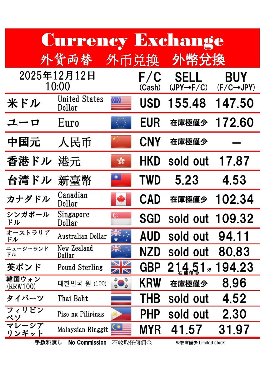 おはようございます #外貨両替フラッグスタッフ です 2025年12月12日(金)の両替レートです Skypeサービス終了に伴い「050-5539-9999」の提供が終了しました 今後は eメール info@flagstaff.co.jpにてお問い合わせ願います 宜しくお願い致します #横浜 #中華街 #海外旅行 #外貨両替 #exchange #yokohama pic.x.com/Rn9j2kBQtd