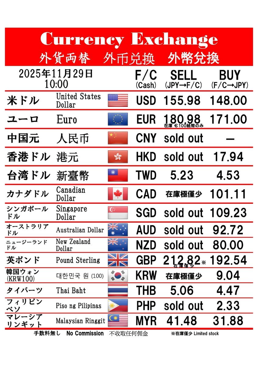 おはようございます #外貨両替フラッグスタッフ です 2025年11月29日(土) の両替レートです Skypeサービス終了に伴い050-5539-9999の提供が終了しました 今後は eメール info@flagstaff.co.jp へお問い合わせ願います 宜しくお願い致します #横浜 #中華街 #海外旅行 #外貨両替 #exchange #yokohama pic.x.com/99N01cmoxO