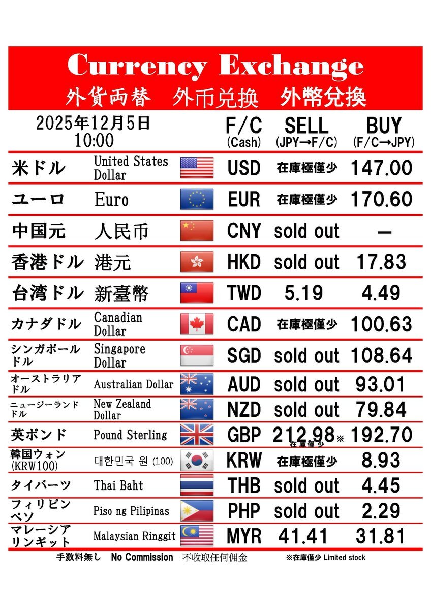 おはようございます #外貨両替フラッグスタッフ です 2025年12月5日(金)の両替レートです Skypeサービス終了に伴い「050-5539-9999」の提供が終了しました 今後は eメール info@flagstaff.co.jpにてお問い合わせ願います 宜しくお願い致します #横浜 #中華街 #海外旅行 #外貨両替 #exchange #yokohama pic.x.com/jYmUWlrGNx