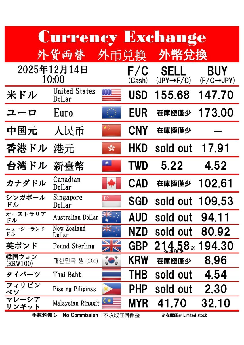 おはようございます #外貨両替フラッグスタッフ です 2025年12月14日(日) の両替レートです Skypeサービス終了に伴い050-5539-9999の提供が終了しました 今後は eメール info@flagstaff.co.jp へお問い合わせ願います 宜しくお願い致します #横浜 #中華街 #海外旅行 #外貨両替 #exchange #yokohama pic.x.com/TfwNocKkuU