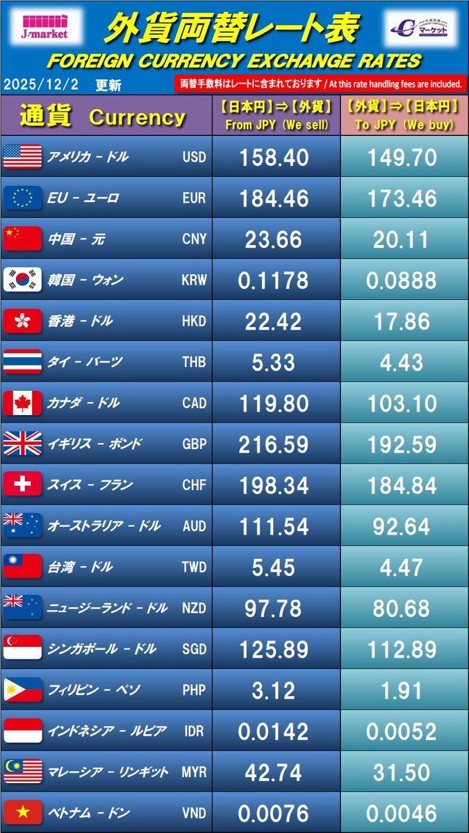おはようございます #外貨両替フラッグスタッフ です 2025年12月2日(火)の両替レートです Skypeサービス終了に伴い「050-5539-9999」の提供が終了しました 今後は eメール info@flagstaff.co.jpにてお問い合わせ願います 宜しくお願い致します #横浜 #中華街 #海外旅行 #外貨両替 #exchange #yokohama pic.x.com/7WJ0RJUBgU