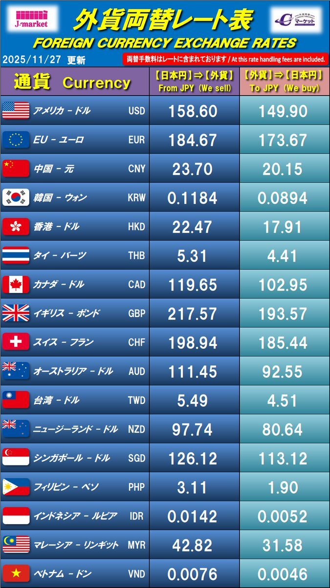 おはようございます #外貨両替フラッグスタッフ です 2025年11月27日(木)の両替レートです Skypeサービス終了に伴い「050-5539-9999」の提供が終了しました 今後は eメール info@flagstaff.co.jpにてお問い合わせ願います 宜しくお願い致します #横浜 #中華街 #海外旅行 #外貨両替 #exchange #yokohama pic.x.com/UW3mUdsasx