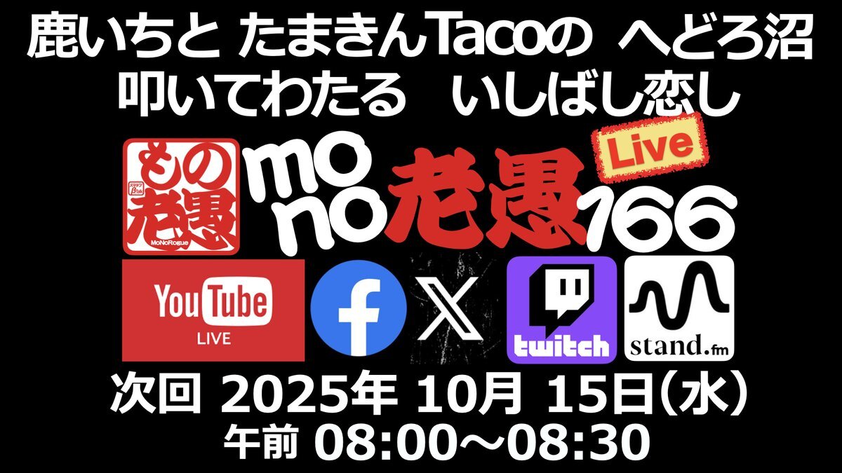 mono老愚166 鹿いちと たまきんTacoに すみかねて 叩いて渡る いしばし恋し 老害仕様のOld skool が 最新デジタルテクノロジーの勘所を 勘違いでカタリ散らかす 要介護系テックトーク 次回 10月 15日(水) 朝 8時 から #YouTube youtube.com/live/je-qGAGUq… #Facebook #twitch #standfm で配信です。 pic.x.com/esXHnYqgzT