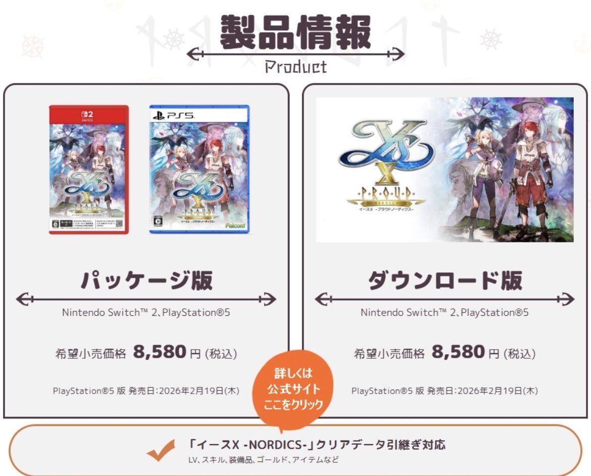 『イース』シリーズ新作『イースⅩ -Proud NORDICS-』PS5版が2026年2月19日に発売決定。冒険家アドルが大海原を航海するアクションRPG news.denfaminicogamer.jp/news/251114o 2023年発売の『イースⅩ -NORDICS-』に新たなストーリーや冒険の舞台、多数の要素を追加し大幅にグレードアップ。4K120FPSでの動作に対応