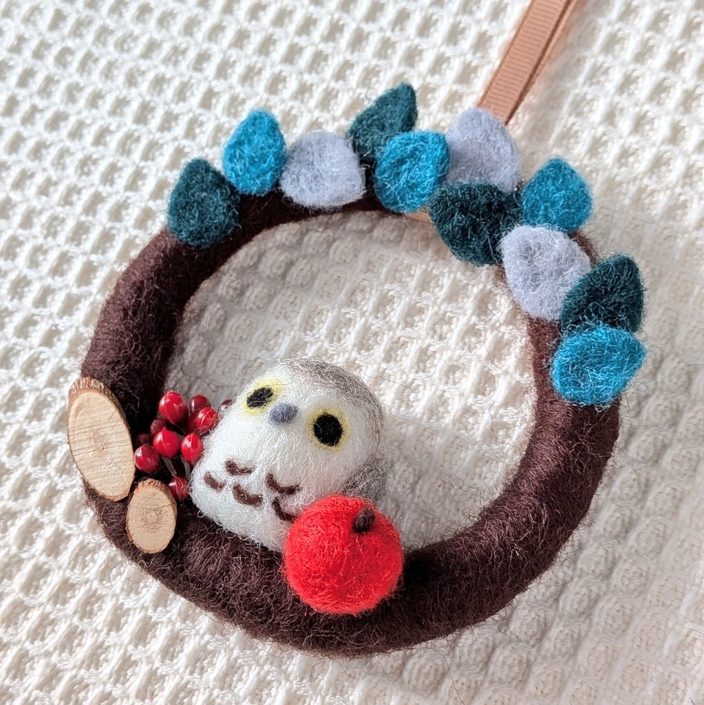 先日コツコツ作りためた葉っぱを使って、ミニリース作りました🦉 クリスマスの関内駅でのイベントに出品予定ですが、クリスマスを過ぎても飾って欲しいデザインです♪ #羊毛フェルト #felt #ハンドメイド #工房暖簾ギャラリー #関内駅チカアート市 #クリスマスリース #フクロウ pic.x.com/0hvEyEKk8C