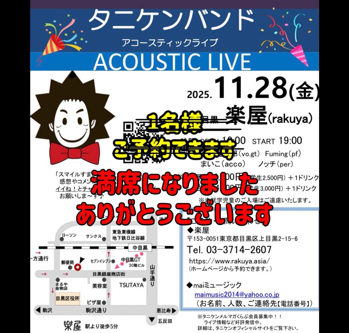 先ほどご予約があり、満席になりました。 本当にありがとうございました‼️ ■11/28(金)タニケンバンド アコースティックライブ 中目黒 楽屋 rakuya.asia 開演19:00〜 #タニケンバンド #谷本賢一郎 #Fuming #まいこ #ノッチ pic.x.com/4nd5cI39hg