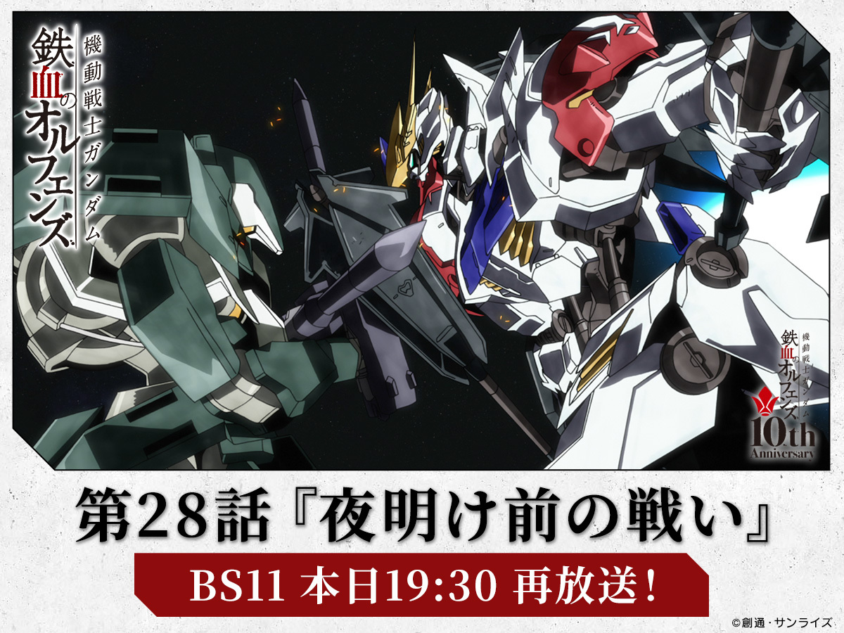 ━━━━\本日19:30~ 再放送!!/━━━━ 『機動戦士ガンダム #鉄血のオルフェンズ』 ━━━━━━━━━━━━━━━━━━━ 第28話「夜明け前の戦い」 本日10/18(土)19:30~ BS11にて放送予定。 是非ご覧ください! bs11.jp/anime/gundam-t… #g_tekketsu #鉄血10周年