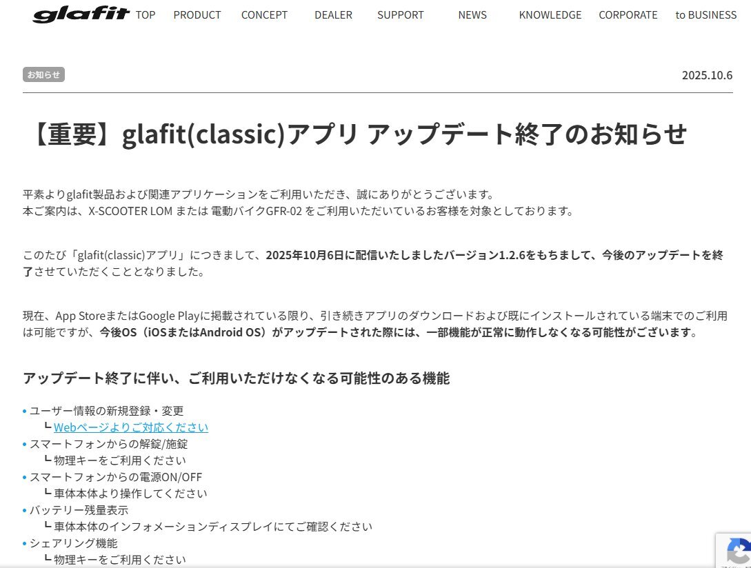 #glafit ももう特定小型原付に行って、モペットとかの原付系はやる気ないんだろうな……と思ってる。 アプリだけじゃなくてハードも完全にアップデート止まってるしね。 glafit.com/news/news20251… pic.x.com/vVHsJYfkOl