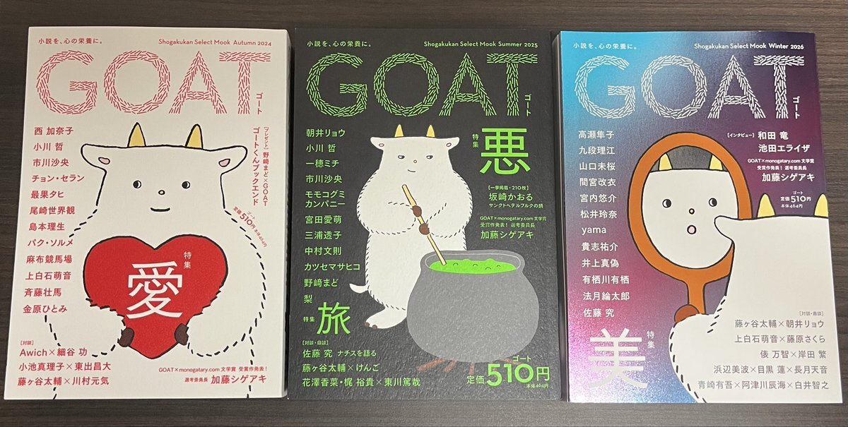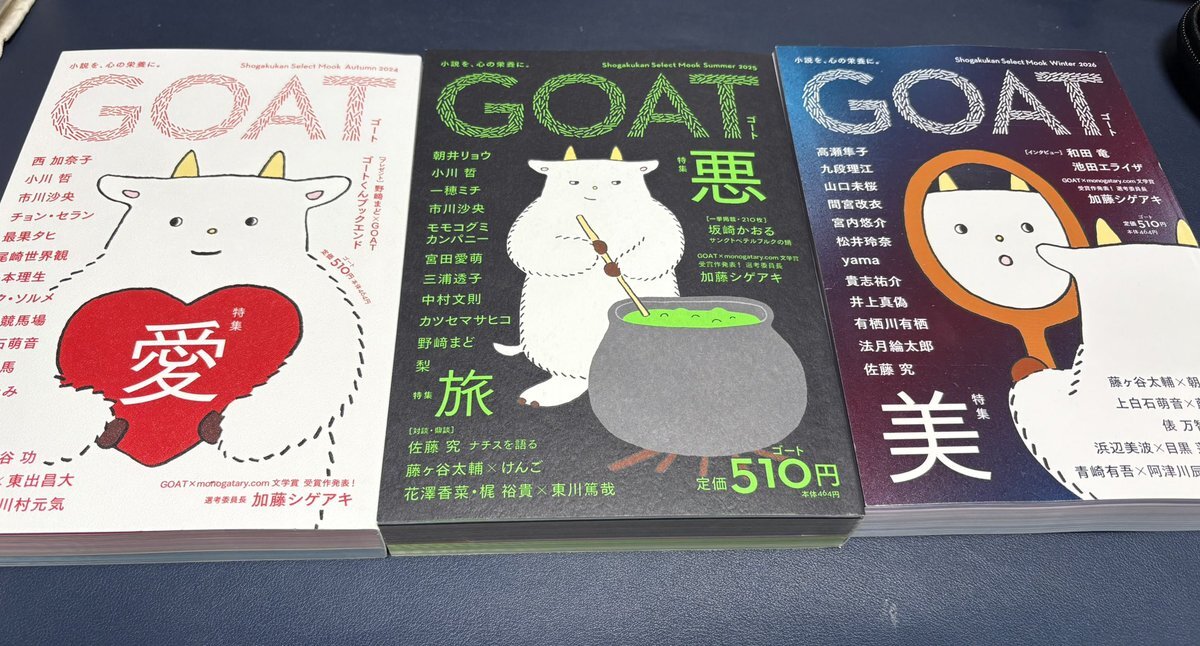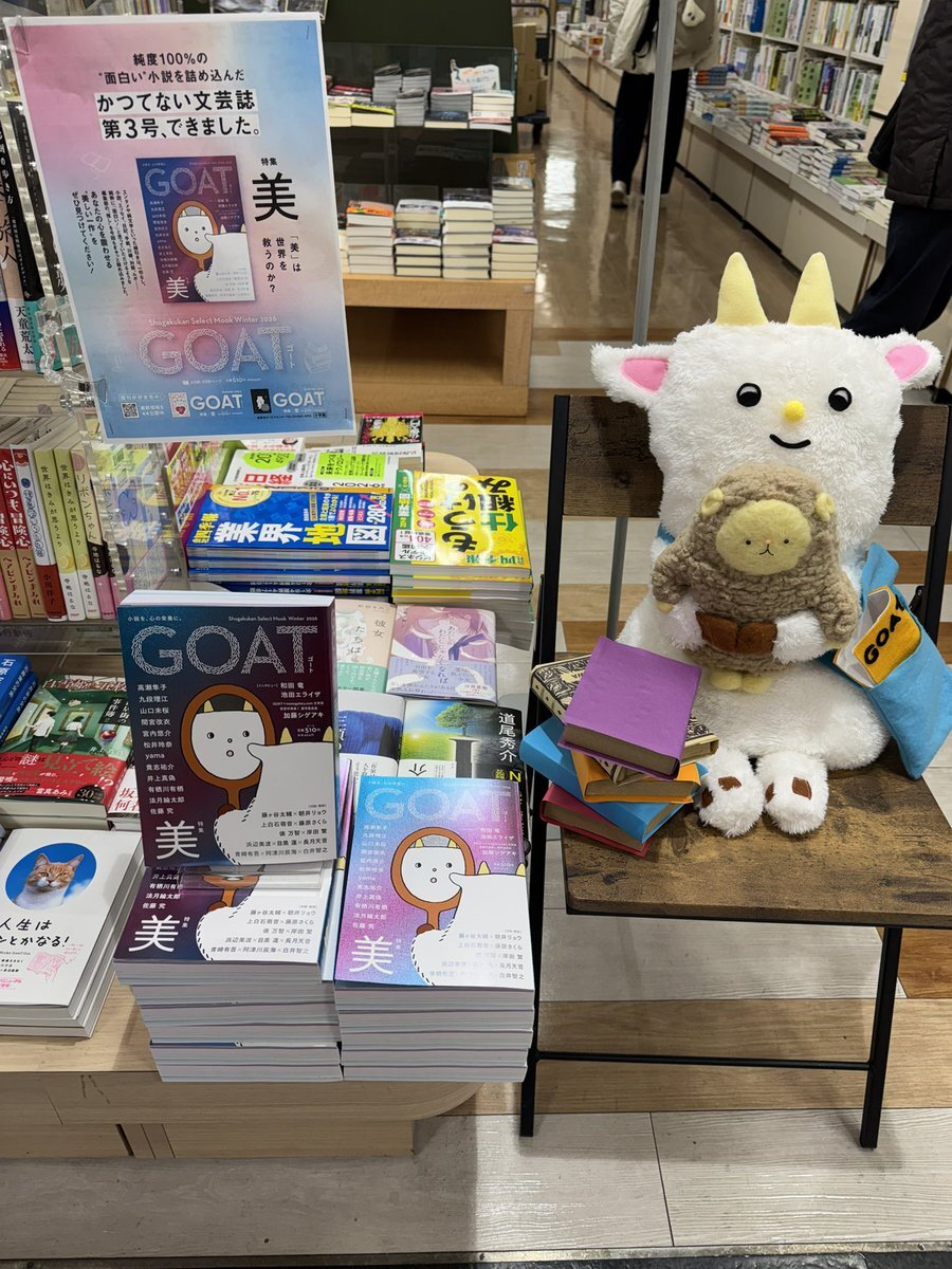 話題の文芸誌『GOAT』!ぴかぴかと発売中です✨💍✨ 今季の特集は「美」。あなたはどんなイメージを抱きますか?👀美を追い求める人、美に疑問を抱く人、みんな集まれ➰ 当店のゴートくんもお待ちしております💌 😈品切れだった「悪」号も再入荷しております! #ゴート #GOAT #小学館 pic.x.com/ucqozB68kA