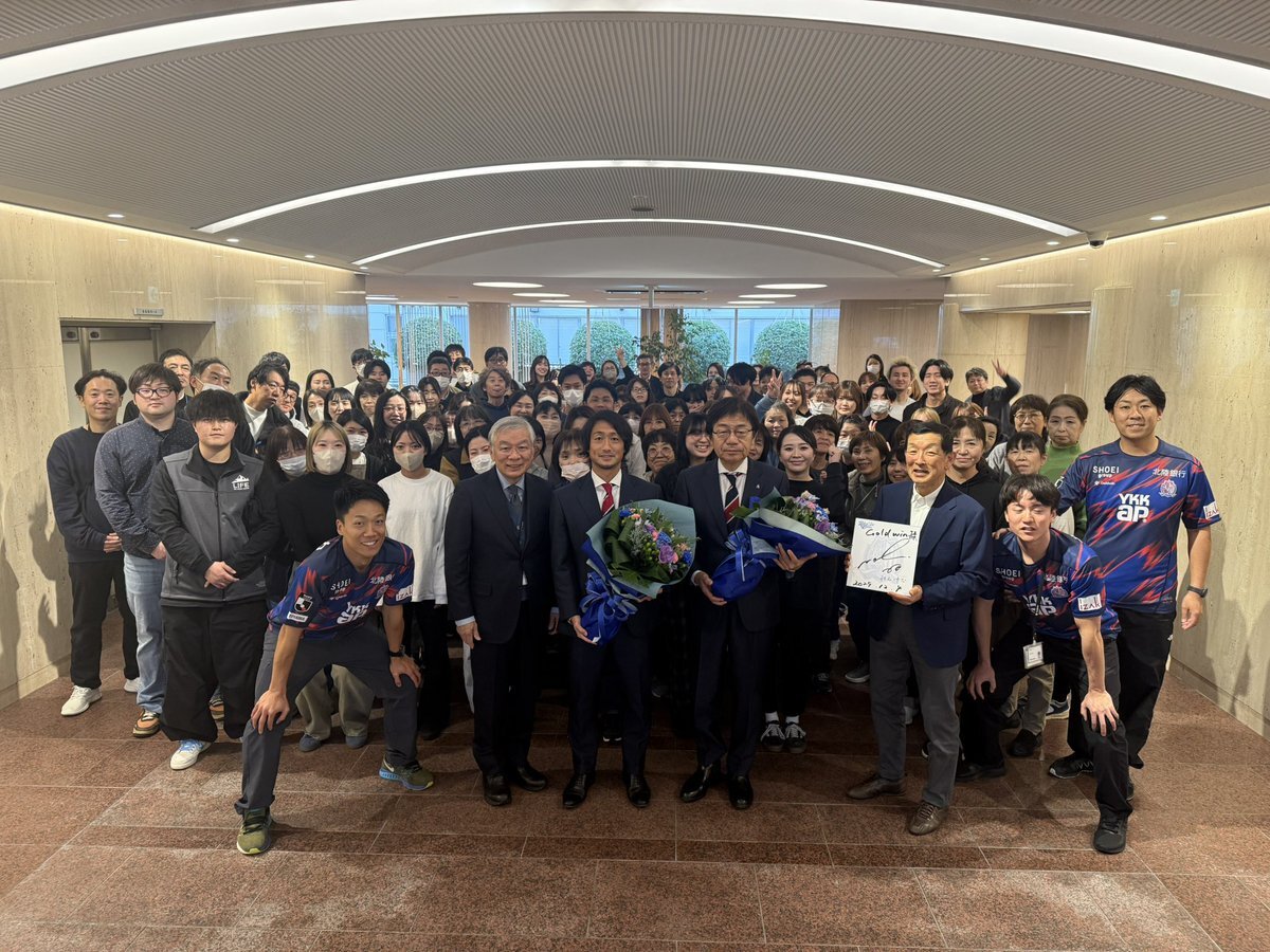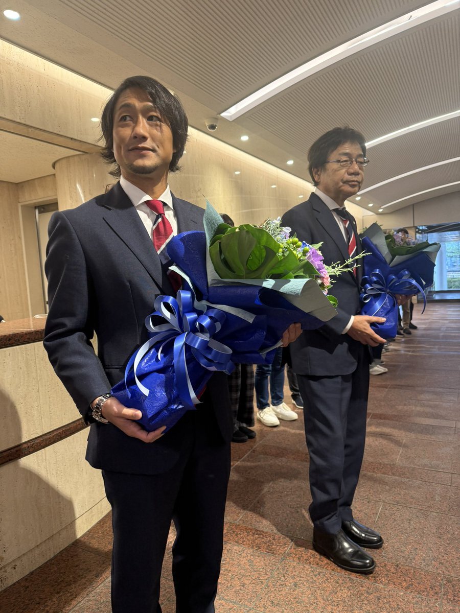 シーズン終了のご挨拶 #GOLDWIN に #左伴社長 #椎名伸志 選手で表敬訪問させていただきました! クラブ設立からサプライヤーとしてユニフォームを製作いただきありがとうございます♡ みなさんと共に、クラブも大きく成長してきました! 素敵な花束もありがとうございました! @Goldwin_jp pic.x.com/Fg65u8IAHc