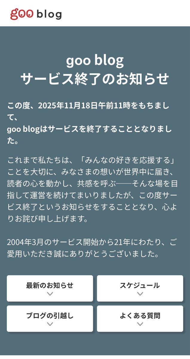 後5時間で「gooブログ」が消滅するはずなので 「X」で最後に感謝でも述べておこうか。 コメント機能は停止しているので… ブログ開設から6966日だそうだ。 って事は19年。 今まで長い間、どうもありがとうございました。 さらば!! blog.goo.ne.jp/higejin/e/a48d… #gooblog