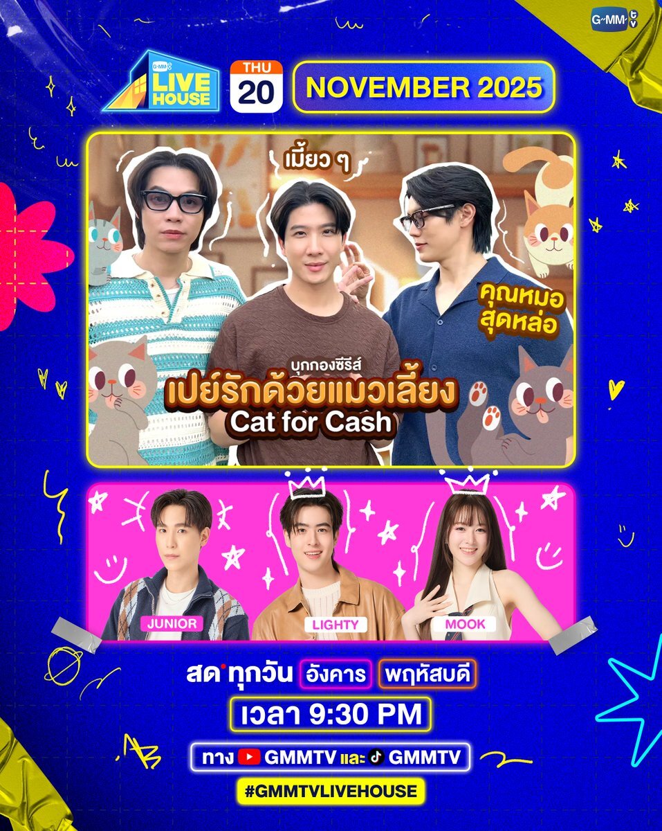 GMMTV Live House คืนนี้ JUNIOR พาน้องใหม่แกะกล่องมาแนะนำตัวให้ทุกคนได้รู้จัก LIGHTY กับ MOOK ผู้ชนะจาก GMMTV POCKY IDOL 2025 และมีภาพบรรยากาศน่ารักๆ จากกองถ่ายซีรีส์ เปย์รักด้วยแมวเลี้ยง Cat for cash มาฝากทุกคนด้วย รอติดตามได้เลย สด 9:30 PM ทาง YouTube : GMMTV Official TikTok :
