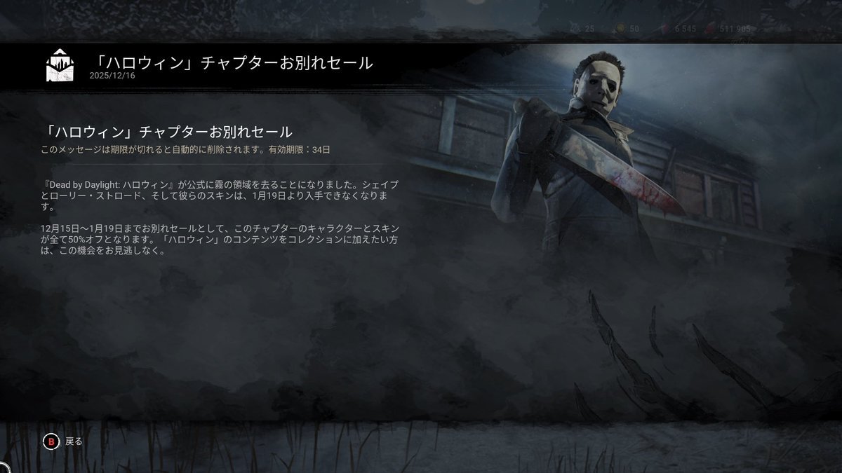 Dead by Daylight HALLOWEENが1月20日を持って販売終了します😥 ・シェイプ(殺人鬼) ・ローリー(生存者) ・ハドンフィールド(ランプキン・レーン) ※マップは使用不可 セールも残り12月19日から、キャラクターやスキンの最後に購入すると以降は使えます💦 寂しい #HALLOWEEN #DeadbyDaylight pic.x.com/rDG4Q8aSM8
