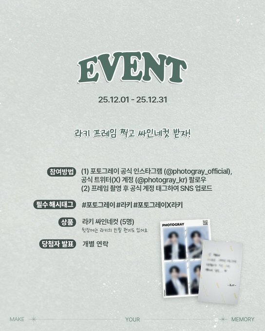 [PHOTOGRAY X 라키] 포그의 지배자, 포그의 정석, 포그의 표본, 포그의 군림자, 포그의 절대자, 포그의 원조, 포그의 신, 포그의 권위자, 포그의 끝판왕, 포그의 황제, 포그의 제왕, 포그의 마스터, 포그의 달인 ╔═══════╗ 라 키 ╚═══════╝ 12/1(월) 18:00 ~ 12/31(수)