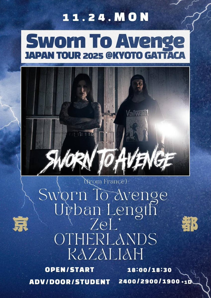 !!!ライブ情報!!! 11/24(月)@京都GATTACA [Sworn To Avenge JAPAN TOUR 2025] OPEN/START 18:00/18:30 前売/当日/学割 ¥2400/¥2900/¥1900 (+1Drink) 出演/ Sworn To Avenge(France) KAZALIAH Urban Length ZeL’ OTHERLANDS
