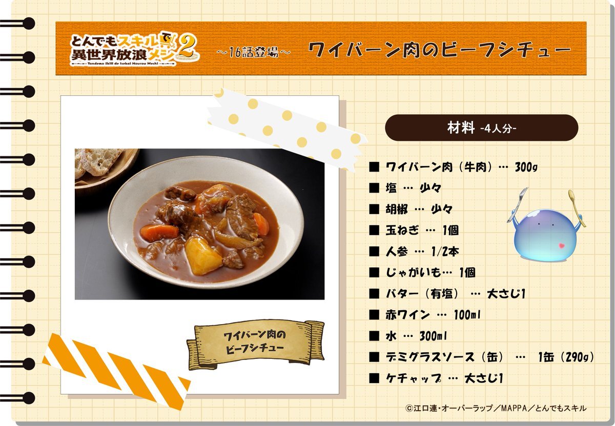 ーーーー◆◇レシピ投稿👨🍳❣️◆◇ーーーー 『#とんでもスキルで異世界放浪メシ 2』 第16話 ワイバーン肉のビーフシチュー ーーーーーーーーーーーーーーーーーーーー 再現レシピを公開中🍴 さらに料理テロップ画像もプレゼント!🎁 「ワイバーン肉のビーフシチュー」🍖🍷