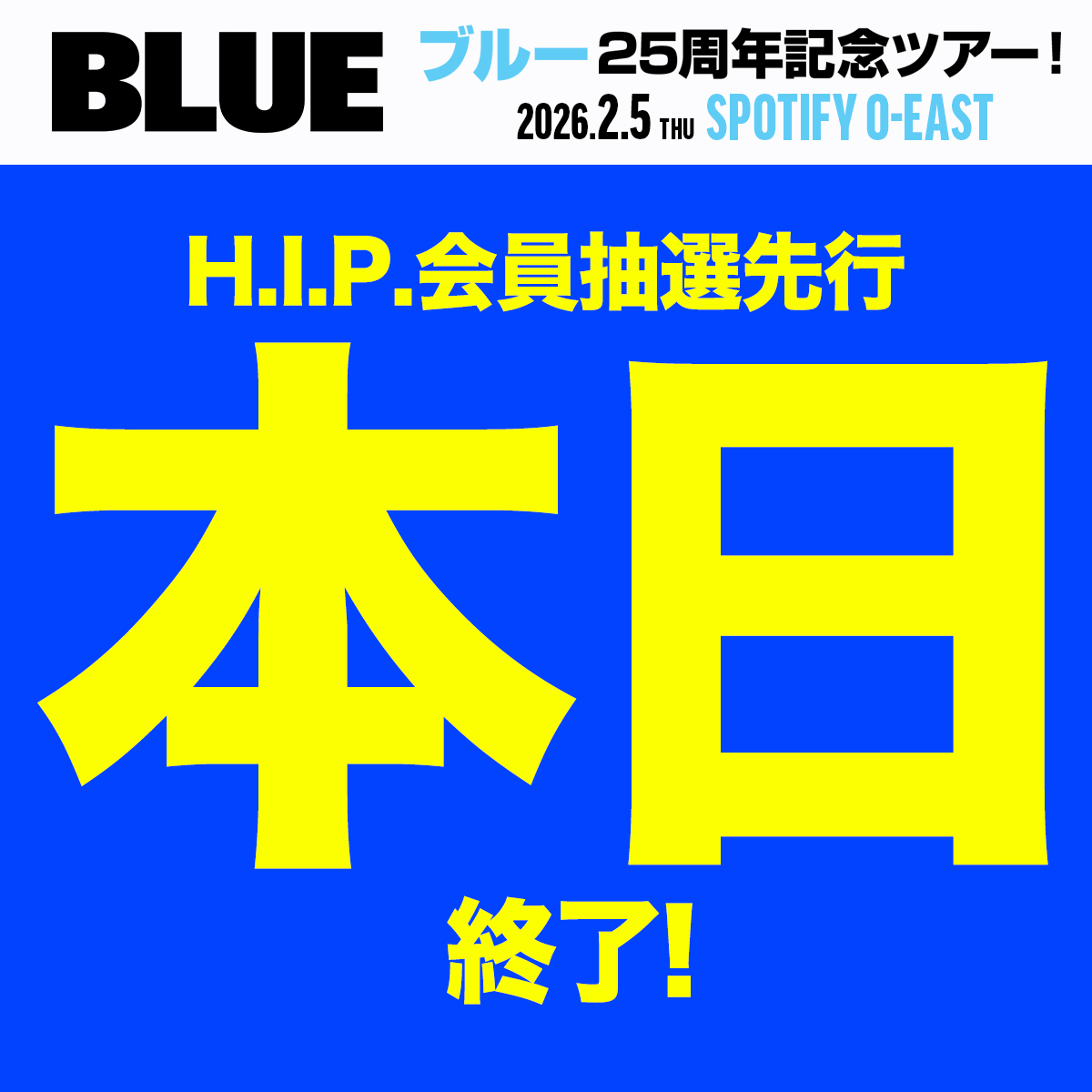 / 🚨H.I.P.会員抽選先行 本日まで! 🔗 hipjpn.co.jp/live/blue2026 \ ブルー 25 周年記念ツアー 申し込み急げ!🏃♀️ 【Blue 25th Anniversary Tour】 2026 年 2 月 5 日(木) Spotify O-EAST #Blue #ブルー #来日公演 #来日 #livenationhip #HIP #livenation pic.x.com/SIFvpUC8Iu