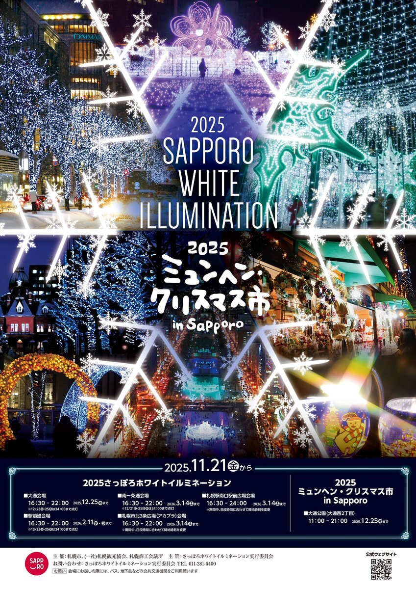 2025年11月21日(金)~2026年3月14日(土)、45回目の開催となる「2025さっぽろホワイトイルミネーション」を大通公園をはじめとした全5会場で開催します。 大通会場2丁目では「ミュンヘンクリスマス市inSapporo」も開催🎄✨ 会場詳細は公式サイトをご覧ください。 sapporo.travel/white-illumina…