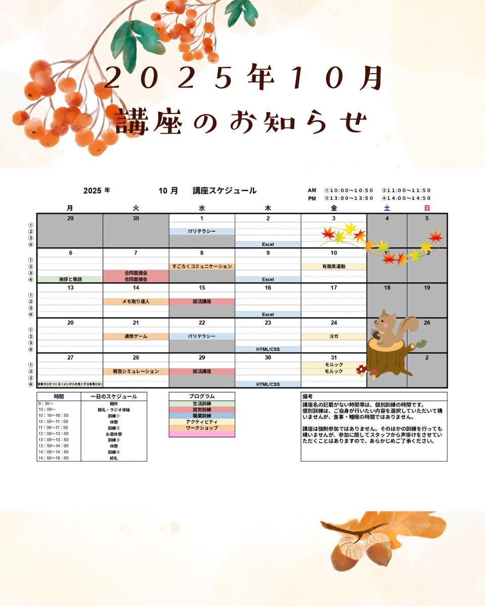 【10月の講座スケジュール公開!】 カラーズ・ラボ広島では、ITリテラシー Excel HTML/CSSなど、実務に役立つ講座を開催中 見学・体験受付中! 082-258-2295 #カラーズラボ広島 #就労移行支援 #ITリテラシー #Excel講座 #HTMLCSS #職業訓練 #広島福祉 #見学受付中 #体験受付中 pic.x.com/vHfTxC6qPc