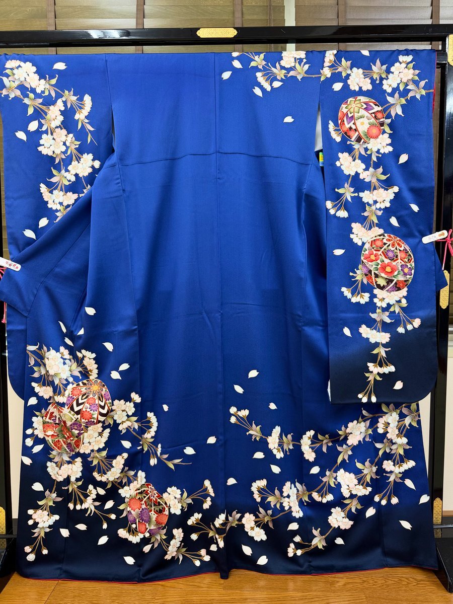 今日の振袖のご紹介、既存の振袖です。身丈168裄67袖110前25後30正絹、しまった紺色の地に桜とまりですね。桜の枝ぶりがかっこいいです。よろしくお願いします。 #振袖 #usedkimono #kimonoshop #hurisode #ueno #akihabara #suehirocho pic.x.com/wZPc5cw91J