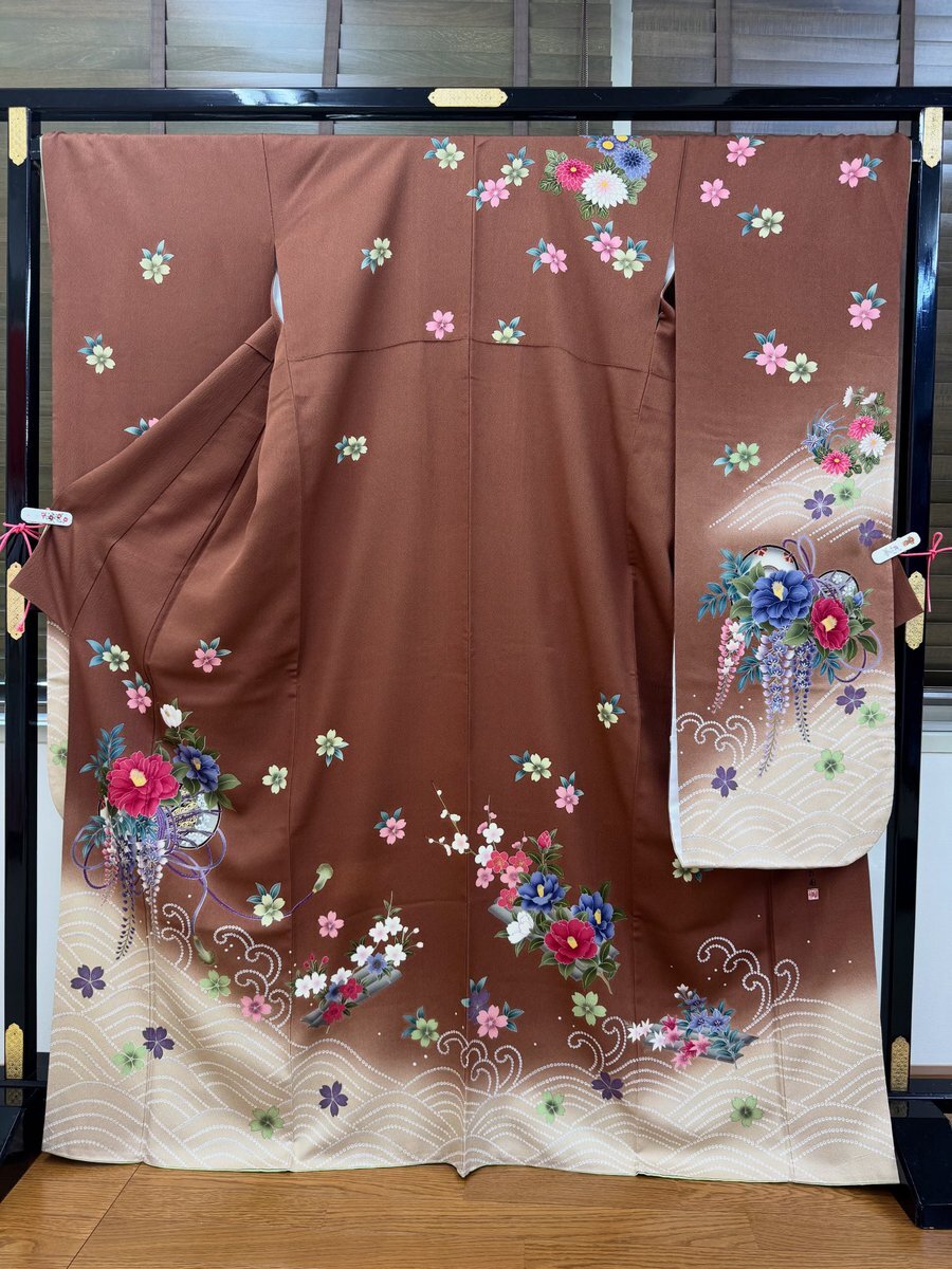 振袖のご紹介、既存の振袖です。身丈167裄68袖112前24後29正絹、茶色の地にお花が散りばめています。可愛いかも。よろしくお願いします。 #振袖 #usedkimono #kimonoshop #hurisode #ueno #akihabara #suehirocho pic.x.com/NAJMdkFpZp