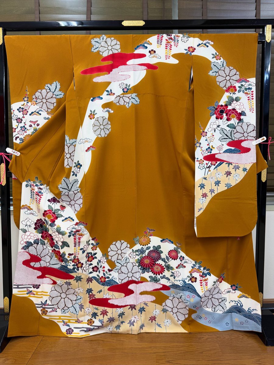 振袖のご紹介、既存の振袖です。身丈167裄67袖108前24後30正絹、山吹色の地に季節を特定しない花柄です。地色は地味でも、わりと華やかに見えそうです。よろしくお願いします。 #振袖 #usedkimono #kimonoshop #hurisode #ueno #akihabara #suehirocho pic.x.com/rkhiEd9ISu