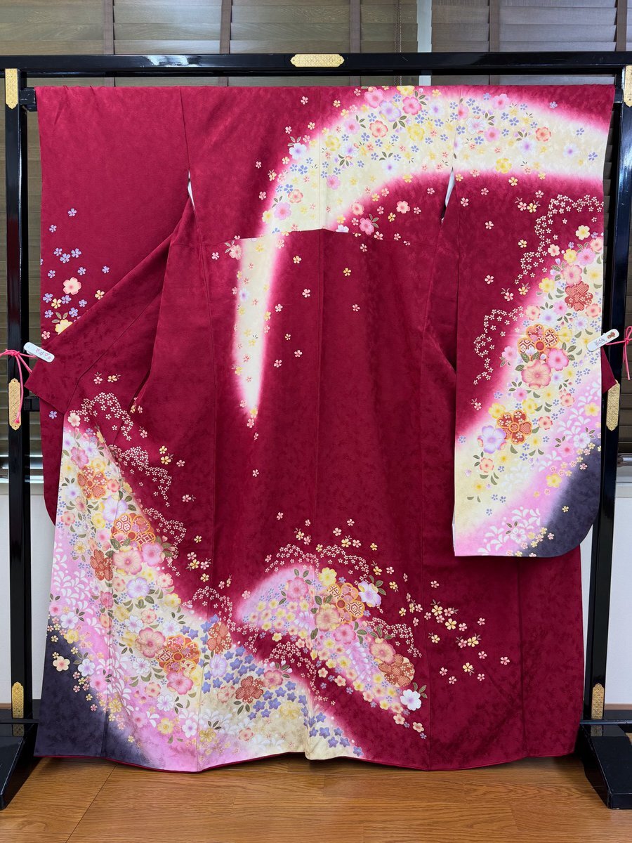 今日のご紹介の振袖、身丈162裄66袖109前24後29正絹、臙脂色に桜なのかな?よろしくお願いします。 #振袖 #usedkimono #kimonoshop #hurisode #ueno #akihabara #suehirocho pic.x.com/72khtl7NNX