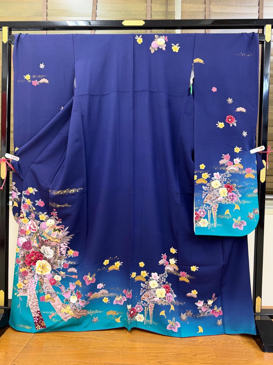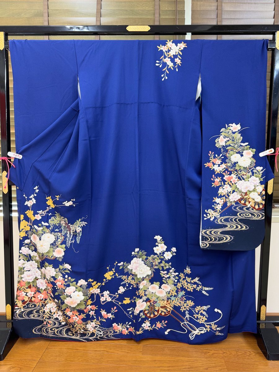 今日の振袖のご紹介、既存の振袖です。身丈165裄66袖106前24後30正絹、紺色の地に花の模様です。よろしくお願いします。 #振袖 #usedkimono #kimonoshop #hurisode #ueno #akihabara #suehirocho pic.x.com/Npr1ck0MDW