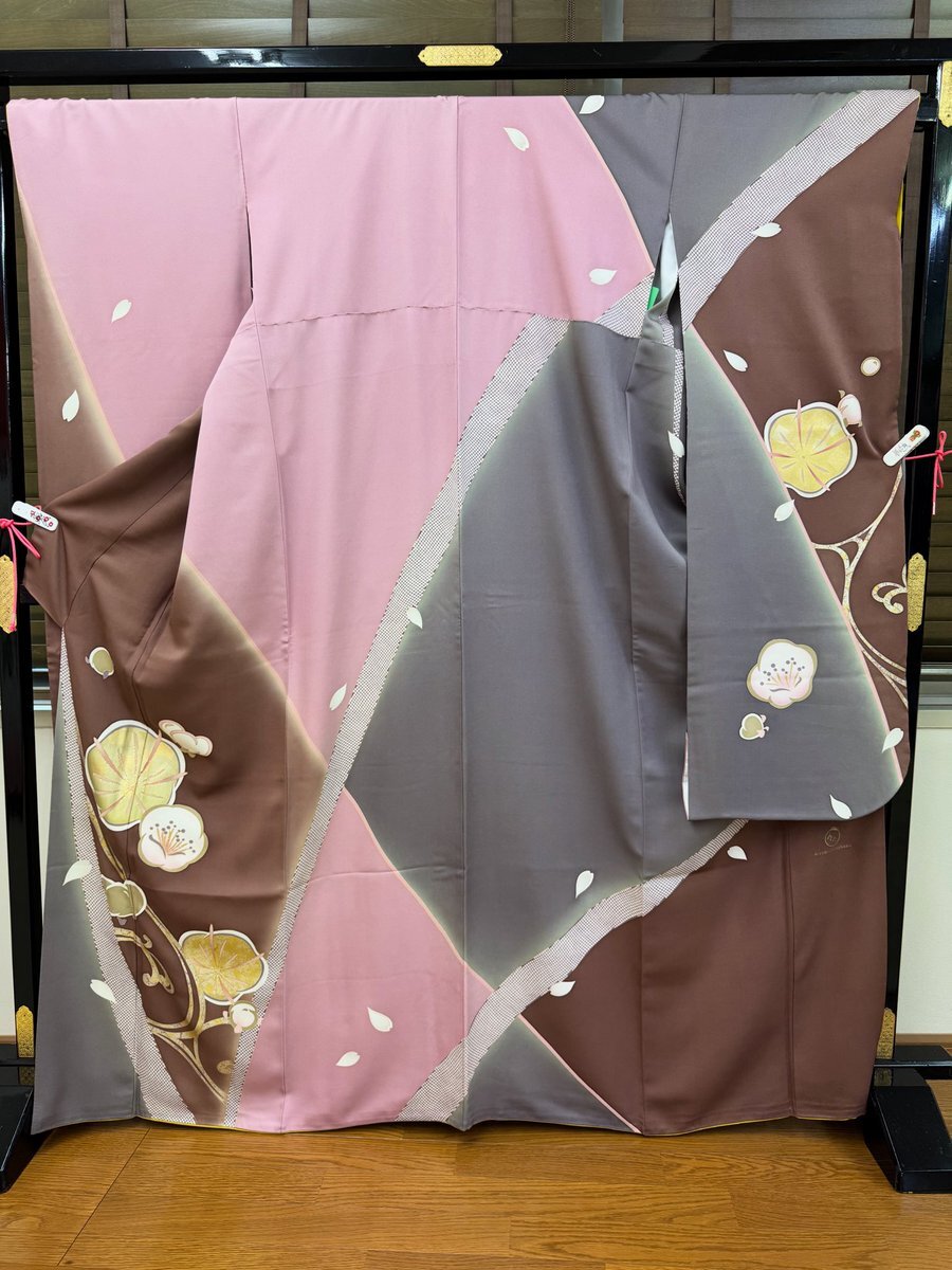 振袖のご紹介、既存の振袖です。身丈165裄67袖108前25後30正絹、たたんだ状態ですとピンクの振袖に見えますが、開いて見れば、三色の大胆な配置のデザインになります。よろしくお願いします。 #振袖 #usedkimono #kimonoshop #hurisode #ueno #akihabara #suehirocho pic.x.com/8wRF8FB2rK