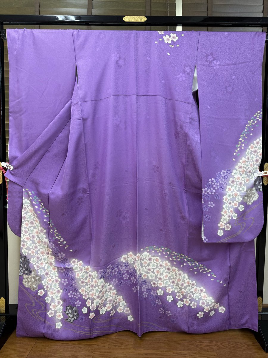 今日の振袖のご紹介、既存の振袖です。身丈167裄66袖109前24後30正絹、藤色の地に桜の模様です。よろしくお願いします。 #振袖 #usedkimono #kimonoshop #hurisode #ueno #akihabara #suehirocho pic.x.com/DwuvraS9sW