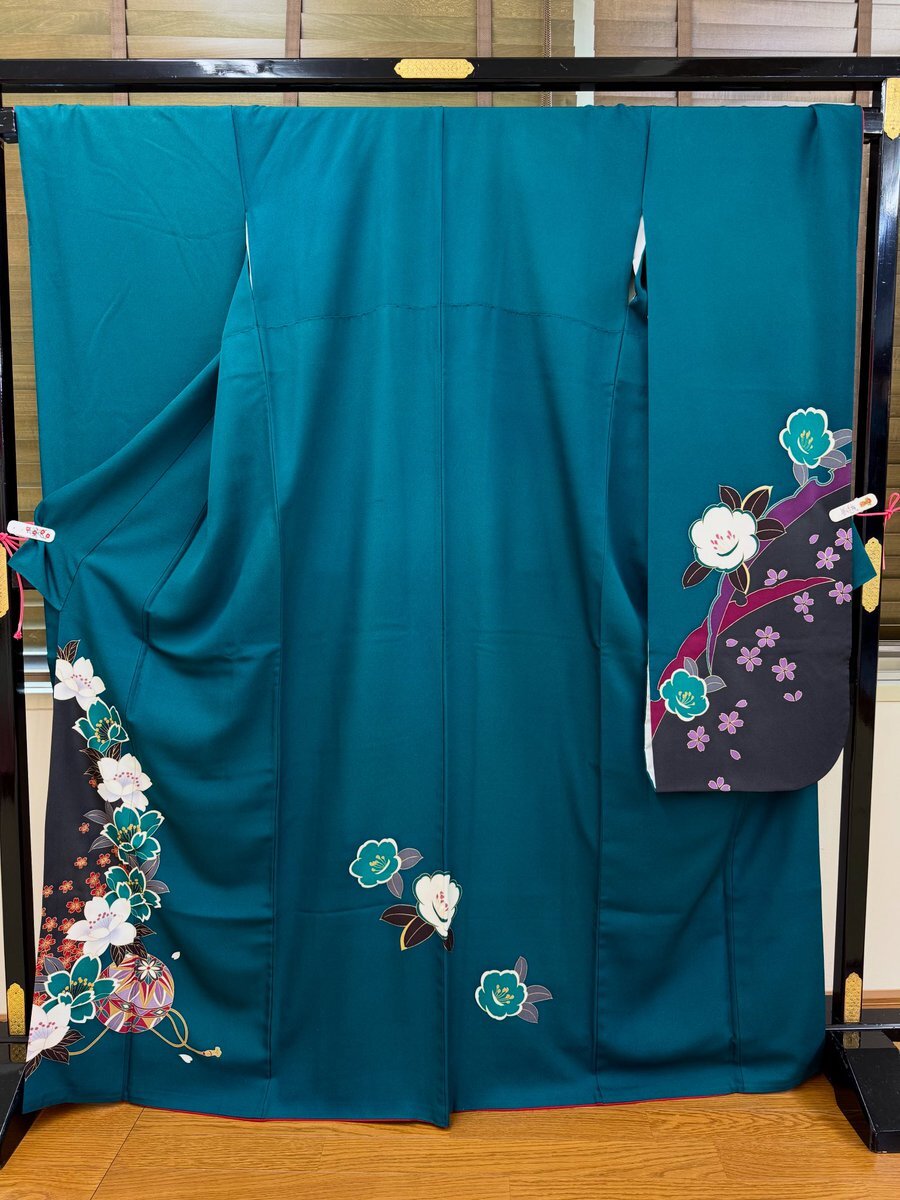 振袖のご紹介、既存の振袖です。身丈166裄67袖108前24後29正絹、エメラルドグリーンの地に椿です。よろしくお願いします。 #振袖 #usedkimono #kimonoshop #hurisode #ueno #akihabara #suehirocho pic.x.com/dyIaCJa3dy