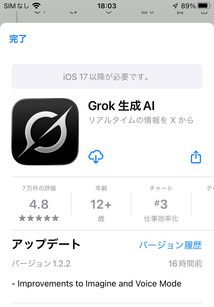但し #iPhone6S ではアプリ版 @Grok のインストール要件を満たさないので 利用する事は出来ない 此れと同じくYahooオークション等 多くのアプリで #iOS16 以下はサポートが打ち切りになって居て利用が出来なくなって居る pic.x.com/ndlibtKGoU