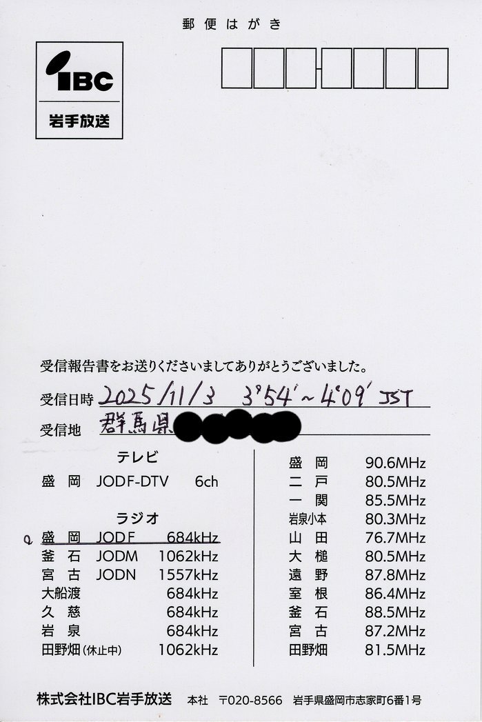 今日は #IBC #岩手放送 さんからベリカードが届きました。有り難うございました。本局の周波数が684KHzとNHK第二放送と693KHzと近くて夕方も693KHzのリークが強くて受信がかなり難しいです。今回は4AM前後を選び妨害を受けないタイミングを利用しました。 pic.x.com/uhLrnWMKC6