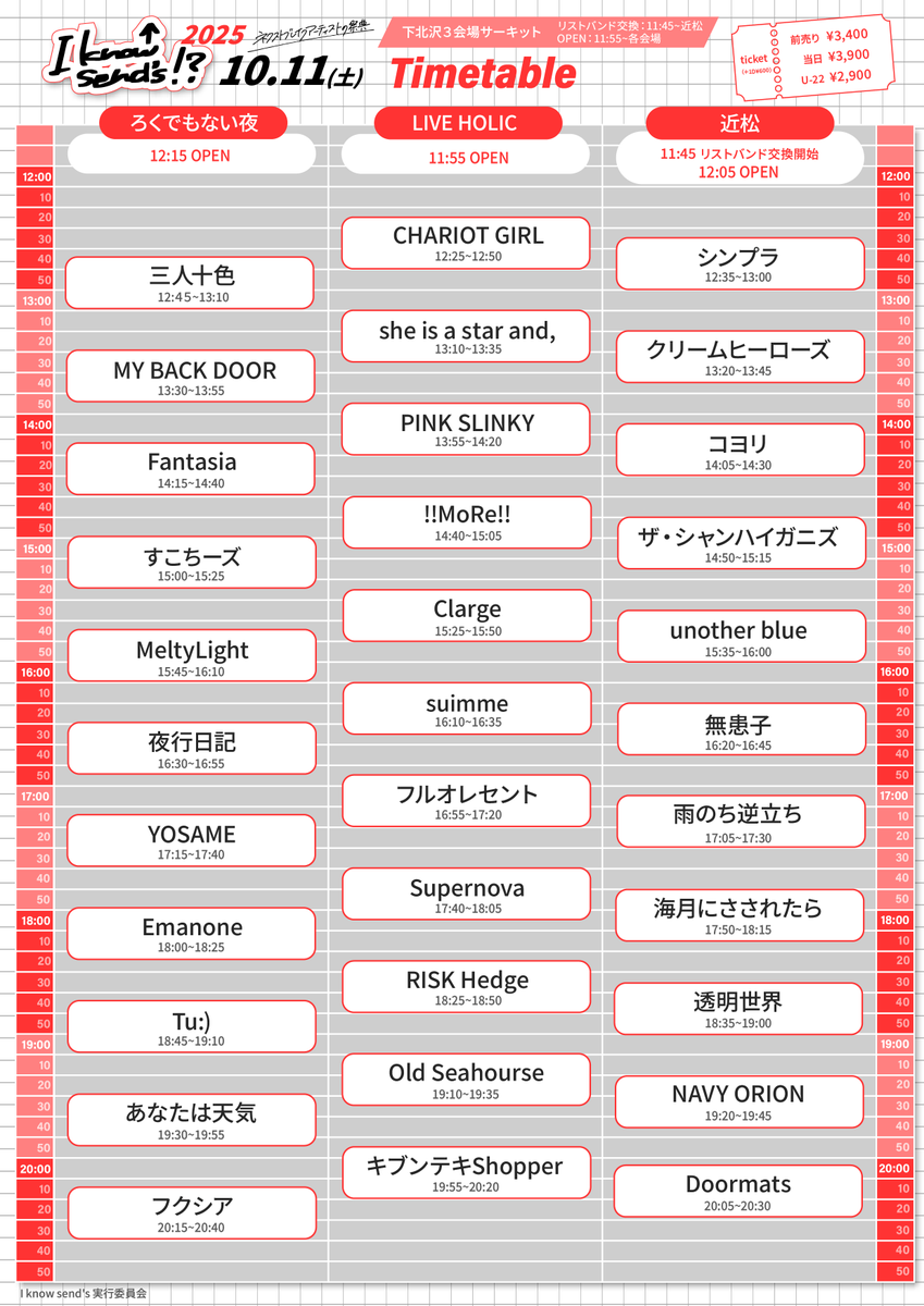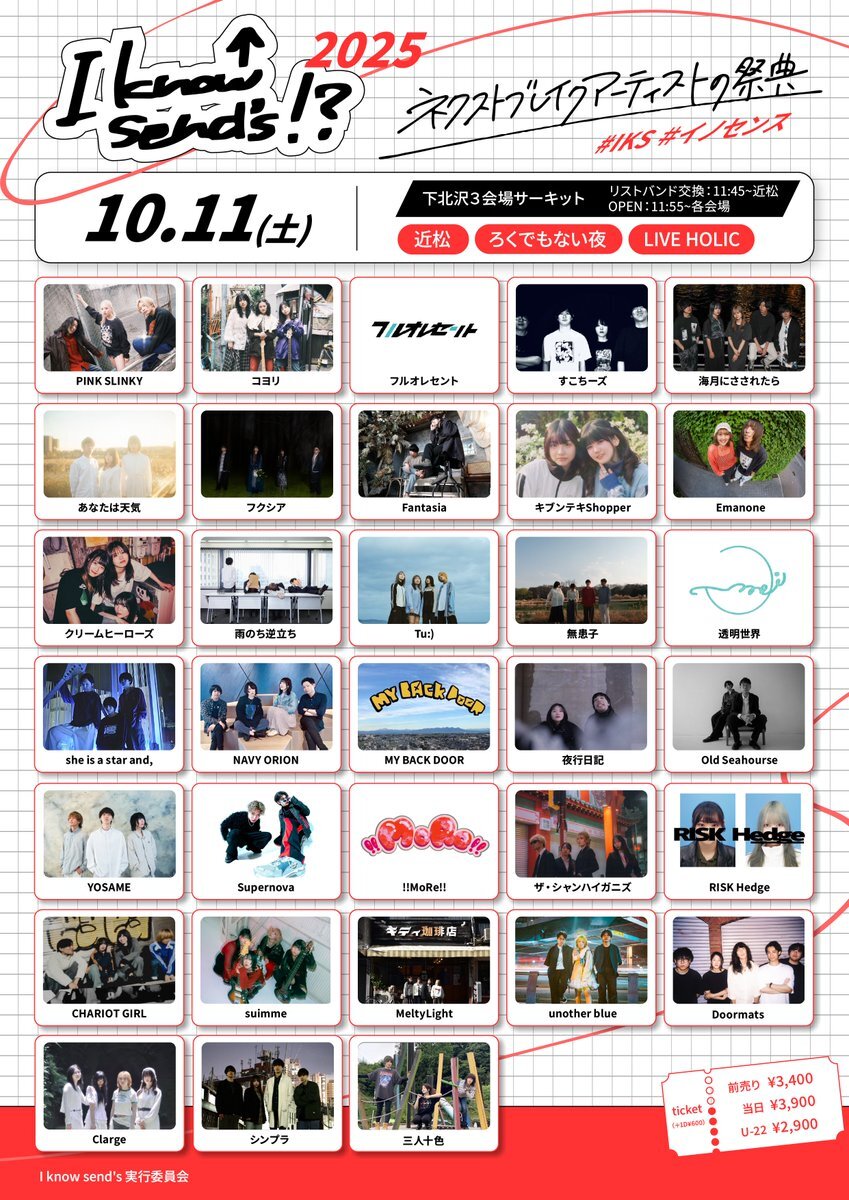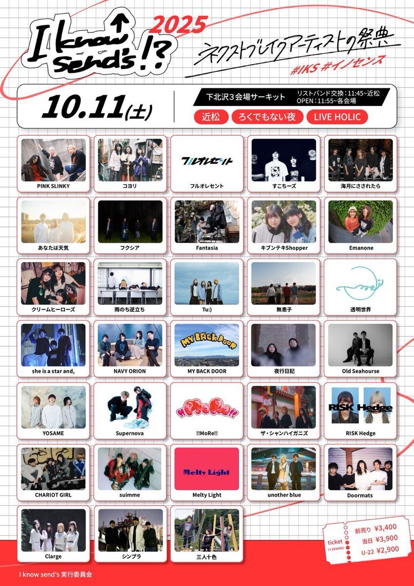 【情報解禁】 10/11(Sat) I know send's実行委員会 pre. 『I know send's!? 2025』 会場: 近松(総合受付)/LIVE HOLIC/ろくでもない夜 チケット: 前売り ¥3,400(+1D¥600) 学割(U-22) ¥2,900(+1D¥600) tiget.net/events/417534 当日 ¥3,900(+1D¥600) #IKS #イノセンス pic.x.com/RjDOkXyRTp