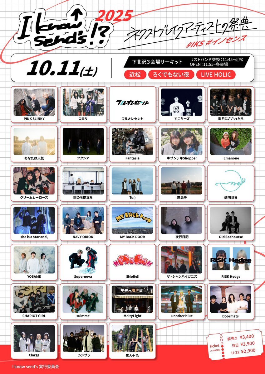 【 次回ライブ 】 2025/10/11(土) I know send's実行委員会 pre. 『I know send's!? 2025』 📍下北沢3会場 近松/ろくでもない夜/LIVE HOLIC チケット予約はコチラ⬇️ tiget.net/events/417534 ついに今週末は初サーキット💫 ろくでもない夜のトッパーです! お待ちしてます🌈 #IKS #イノセンス pic.x.com/S4yoXmhXkK