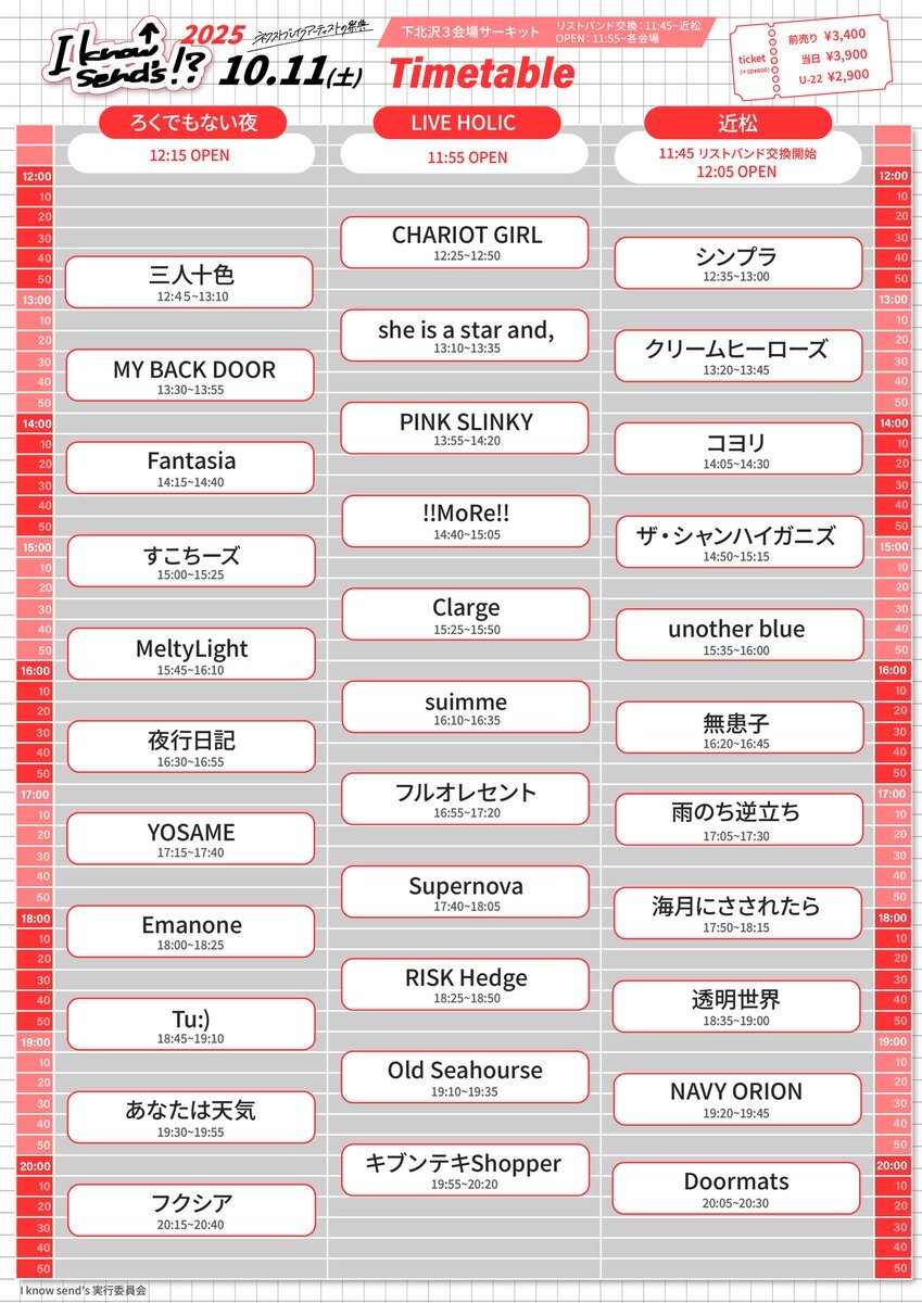 🎸LIVE情報🎸 2025.10.11(土) ”I know send's!? 2025” 📍近松/LIVE HOLIC/ろくでもない夜 ※Doormatsは 「20:05〜@近松」 前売り ¥3,400(+1D¥600) 学割(U-22) ¥2,900(+1D¥600) 当日 ¥3,900(+1D¥600) 🎫チケット受付 tiget.net/events/417534 (DM・メールも応相談) #IKS #Doormats pic.x.com/hl0WK2oHyq
