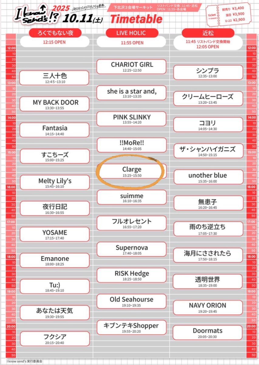 \\今週の土曜日は// 『I know send's!? 2025』 Clargeは15:25~ 下北沢LIVEHOLICに集合‼️‼️ チケット予約はこちらから⤵️ 🔗 tiget.net/events/417534 ※~10/10(金)23:59 #IKS #イノセンス #サーキット #ライブ #下北沢 #インディーズバンド #ガールズバンド pic.x.com/RBN3pvfSS0